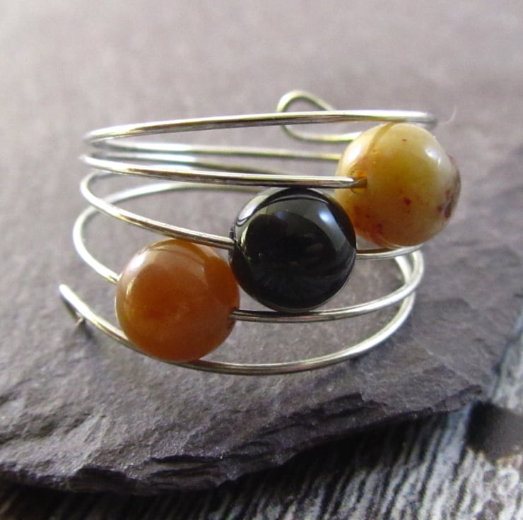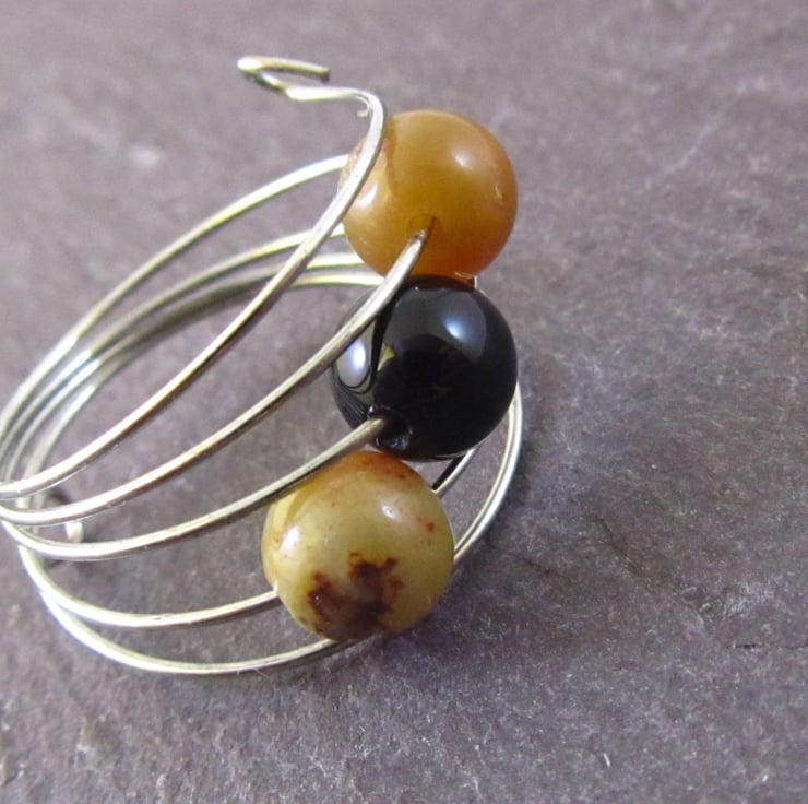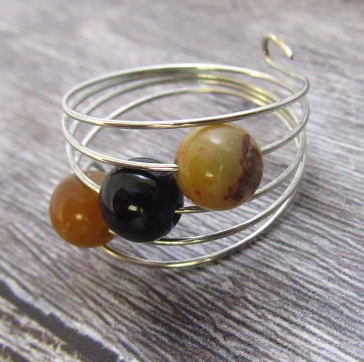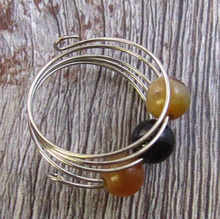 This is a stunning brown black agate silver memory wire ring. It is created with silver memory wire, real brown agate gemstones and real black agate gemstones. The gemstones are really shiny.
