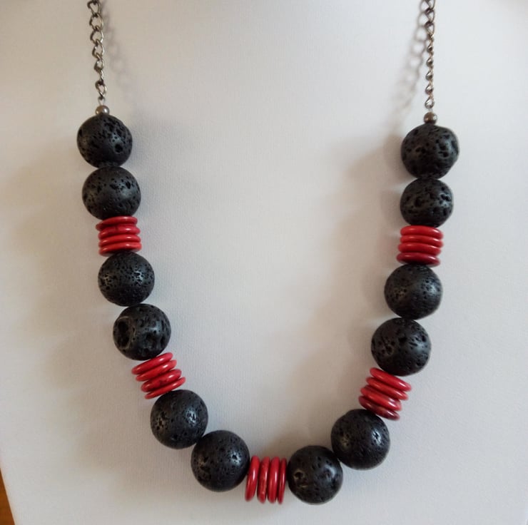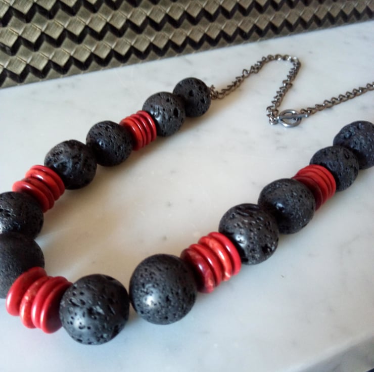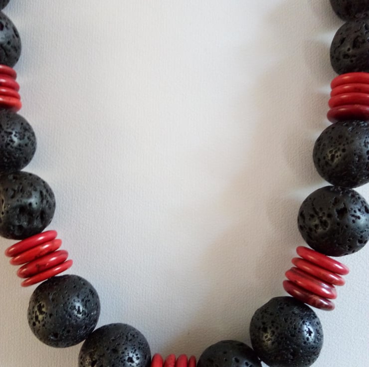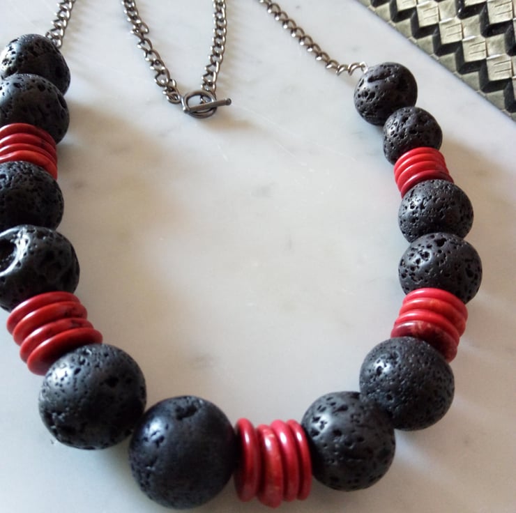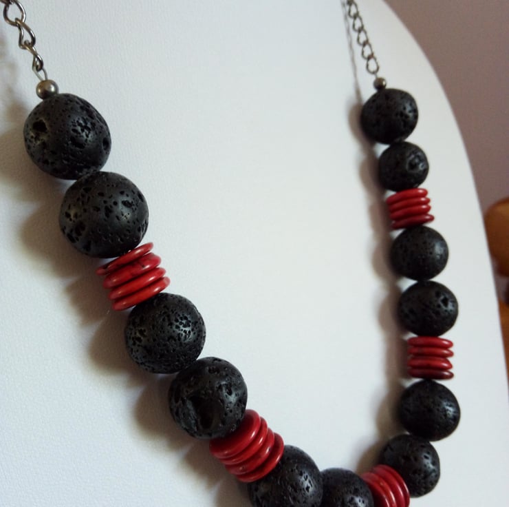 SALE - BLACK LAVA AND RED MAGNASITE NECKLACE - LAVA NECKLACE - FREE UK SHIPPING