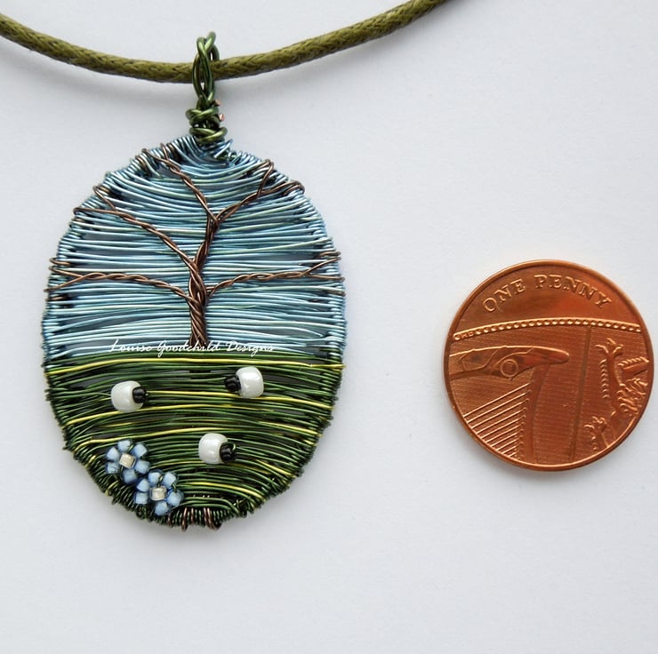 One of my smaller woven pendants, featuring the distinctive wire work style common in my larger pendants, including a woven wire backdrop. Made entirely from high quality coloured copper wire, with glass seed beads, this pendant depicts sheep grazing beneath an oak tree, with tiny blue flowers in the foreground.