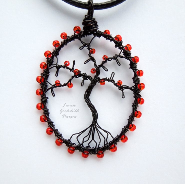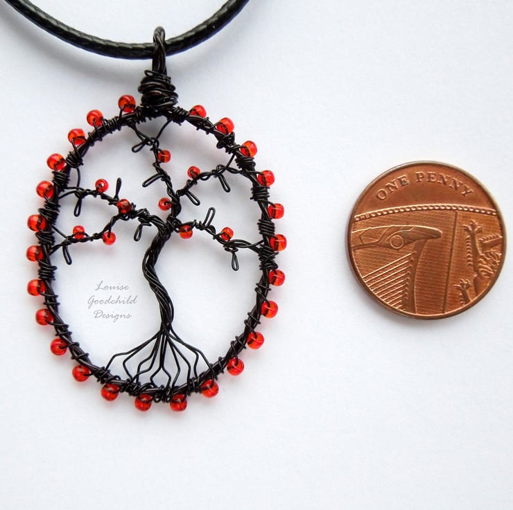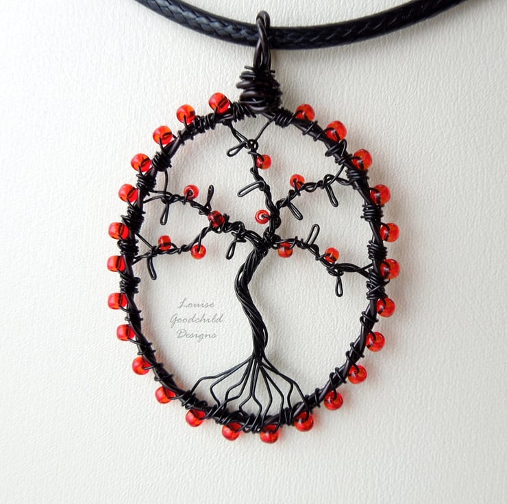 One of my smaller tree pendants, featuring the distinctive wire work style common in my larger pendants. Made entirely from high quality coloured copper wire, with glass seed beads, this one features a thorny black tree with blood-red beads.