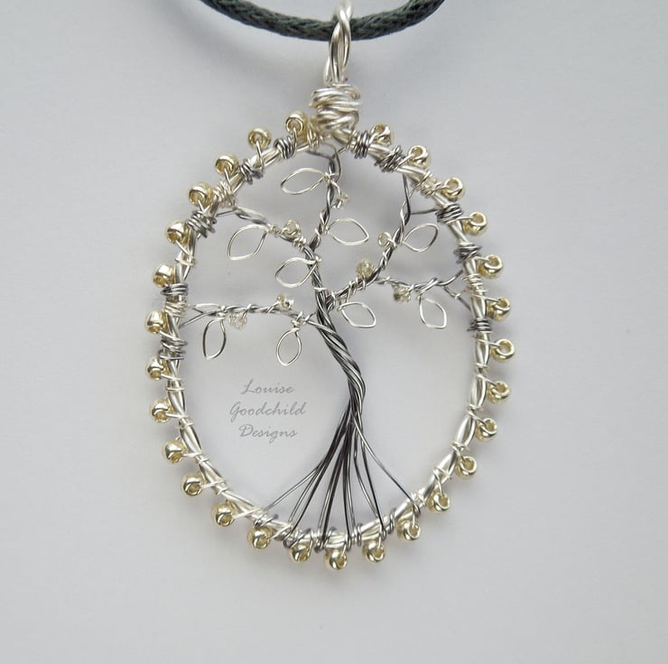 One of my smaller tree pendants, featuring the distinctive wire work style common in my larger pendants. Made entirely from high quality coloured copper wire, with glass seed beads, this one features a shimmering pewter coloured tree with non-tarnish silver frame and beads.