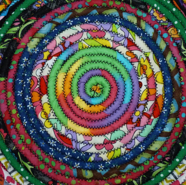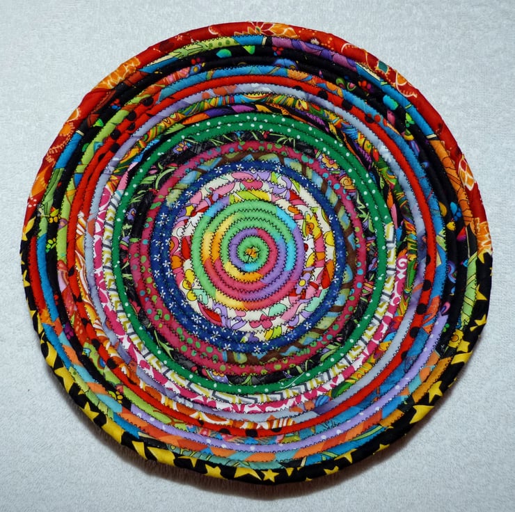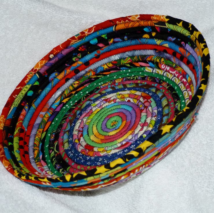 I have created this fabric covered coil basket from a selection of bright coloured cotton fabrics. These have been wrapped around cording and stitched to form the basket. It is quite sturdy and beautiful as a piece of art or can be used to keep little bits and pieces tidy.