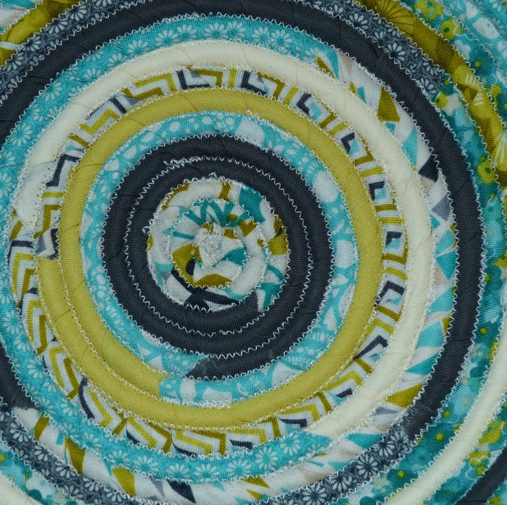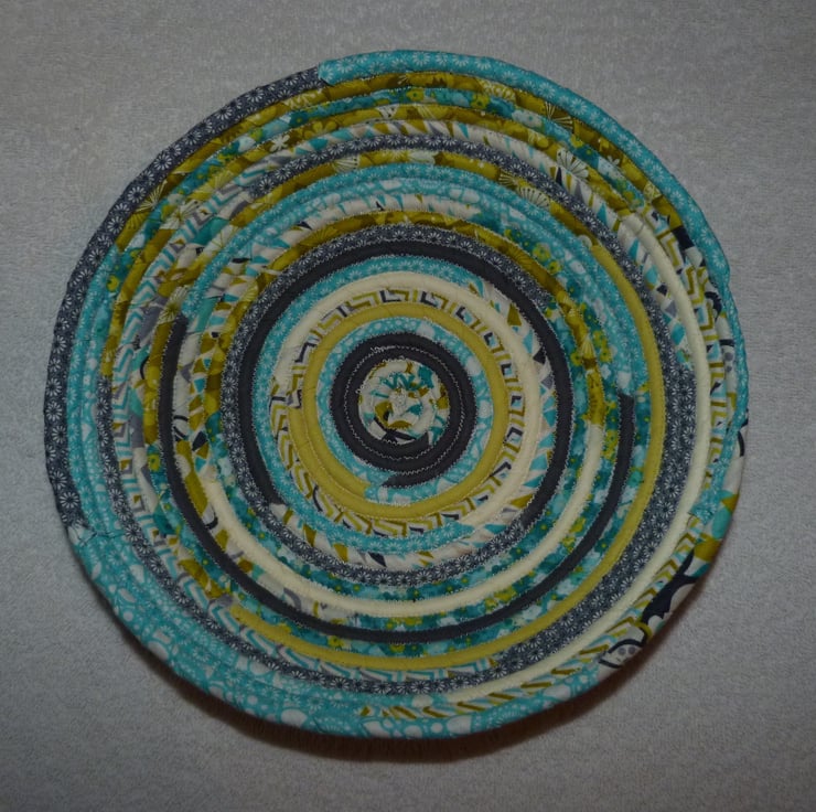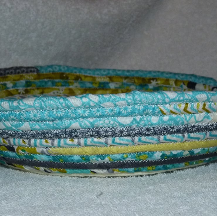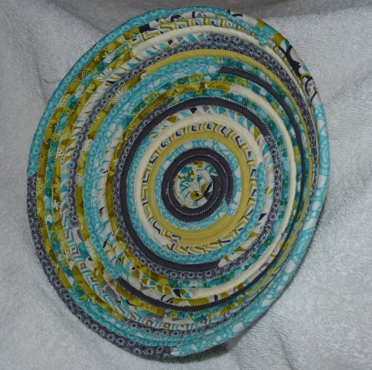 I have created this fabric covered coil basket from a selection of co-ordinated coloured cotton fabrics. These have been wrapped around cording and stitched to form the basket. It is quite sturdy and beautiful as a piece of art or can be used to keep little bits and pieces tidy.
