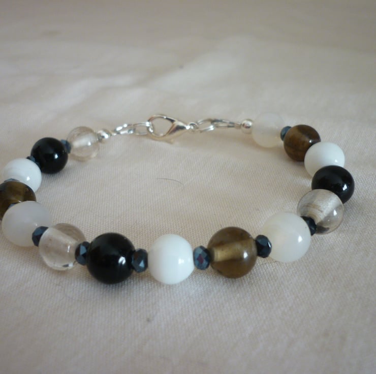 THE BRACELET HAS BEEN MADE WITH 8MM GLASS ROUND BEADS FROM A SNOWSTORM COLLECTION OF GLASS BEADS. THE COLOURS ARE CLEAR, WHITE OPAQUE,GREY AND BLACK ALONG WITH HEMATITE FACETED RONDELL SPACER BEADS AND FINISHED WITH SILVER PLATED LOBSTER CLASP AND FINDINGS.