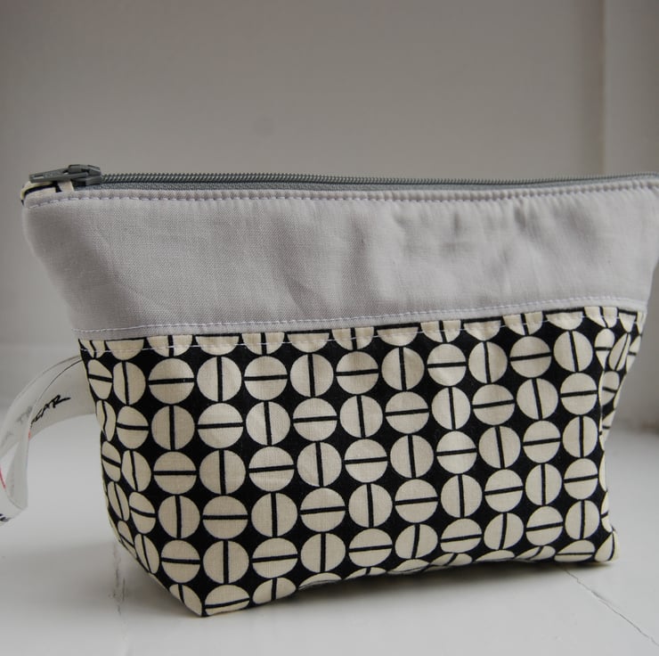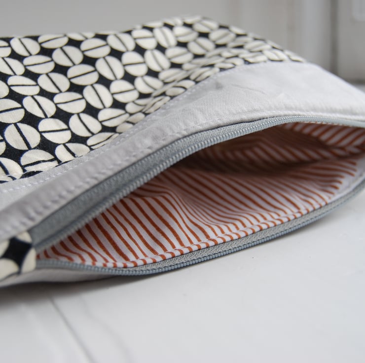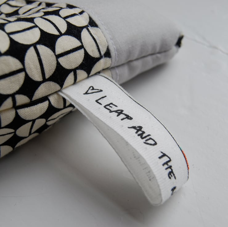A stylish, padded make-up bag. Made from contrasting 100% cotton fabric. Fully lined with YKK zip enclosure Patterned lining fabric. Features a pull tab which states "Leap and the net will appear" (from a Cotton and Steel selvedge). Machine washable. Free post and packaging within UK.