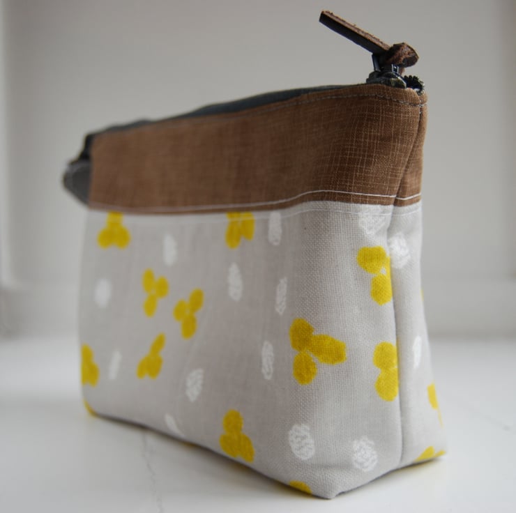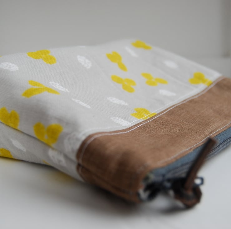 A stylish, padded make-up bag. Made from contrasting 100% cotton fabric. The bottom patterned fabric is japanese double gauze, which makes this bag exceptionally soft and tactile. Fully lined with YKK zip enclosure Patterned lining fabric. Features a pull tab which states "Leap and the net will appear" (from a Cotton and Steel selvedge). Machine washable. Free post and packaging within UK.