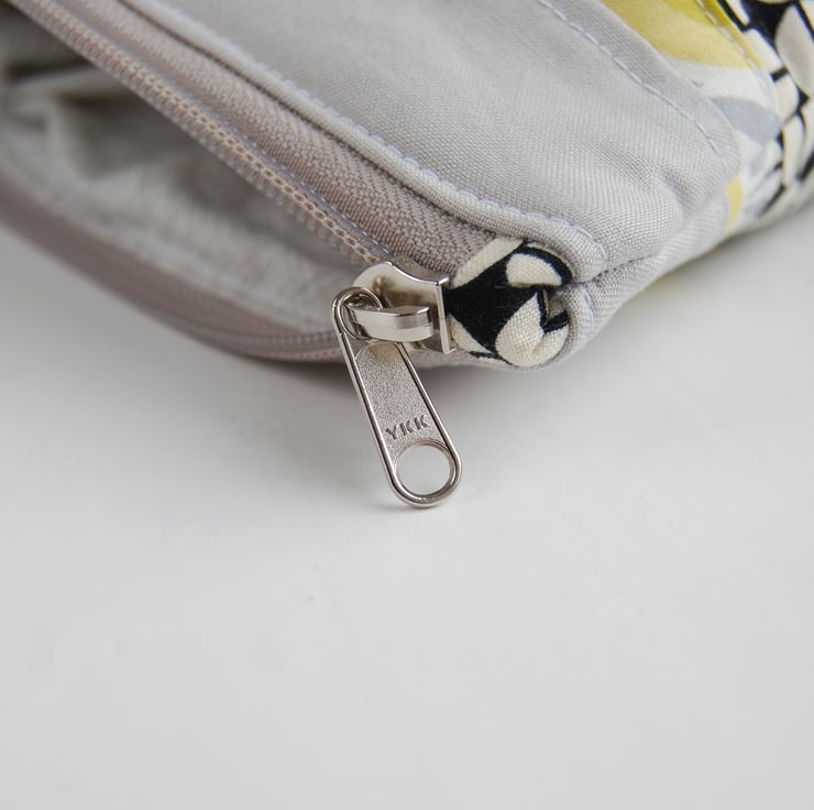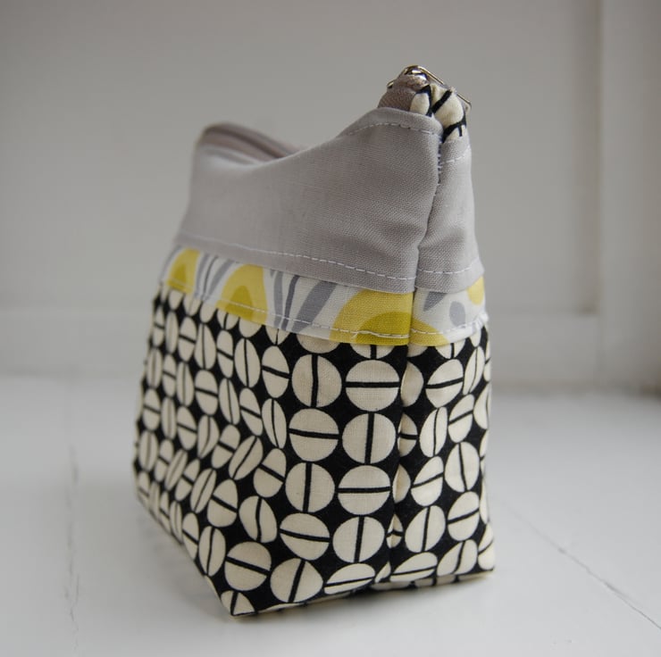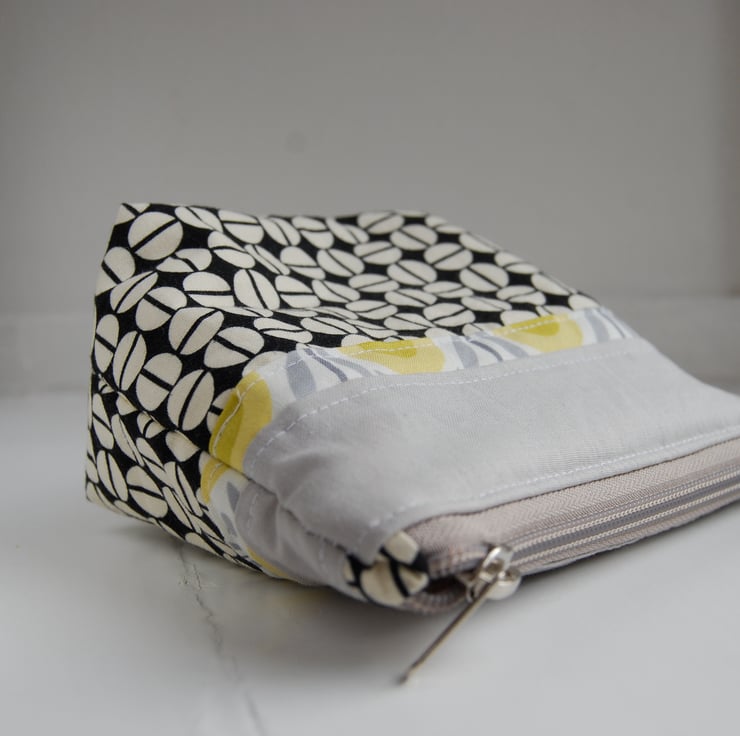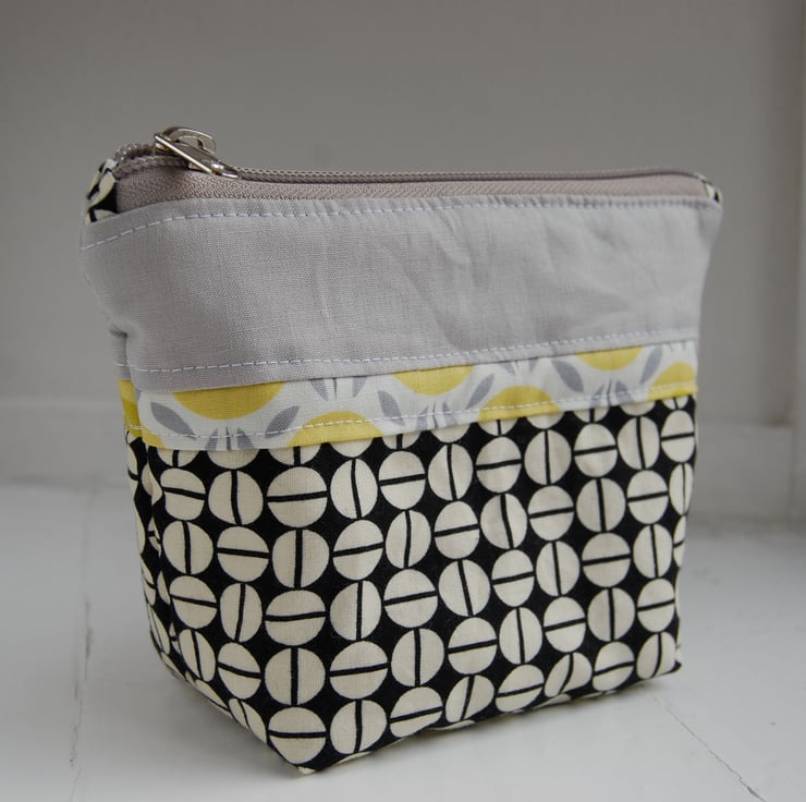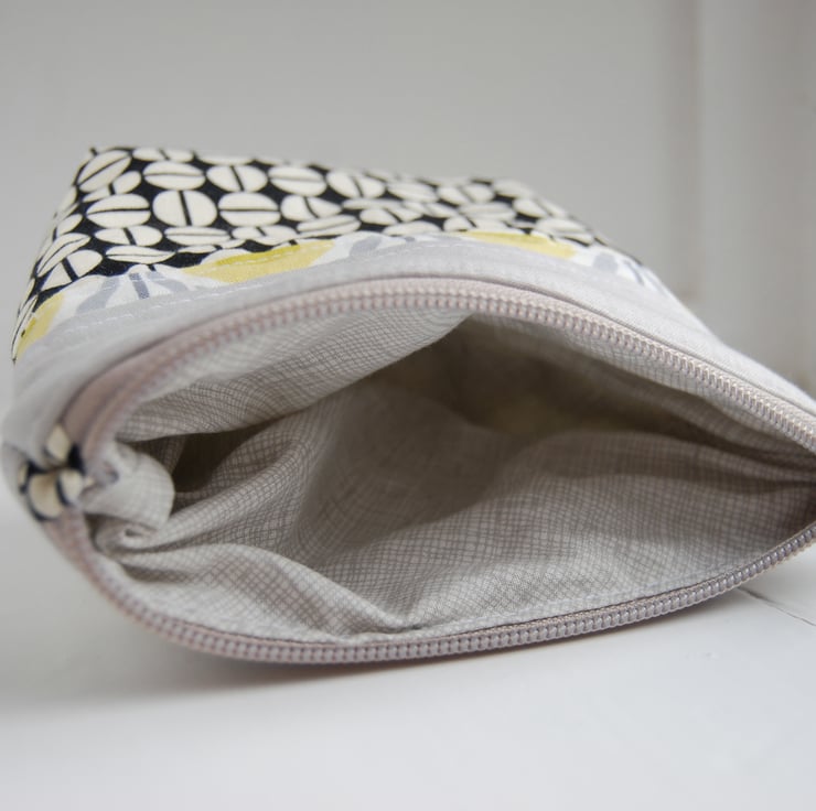 A stylish, padded zipped pouch which can be used for make-up or any collection of small objects. Made from contrasting 100% cotton fabric with faux piping detail along the join. Fully lined with YKK zip enclosure and silver coloured long zip pull. Grey cotton lining fabric with crosshatch pattern design. Machine washable. Free post and packaging within UK.