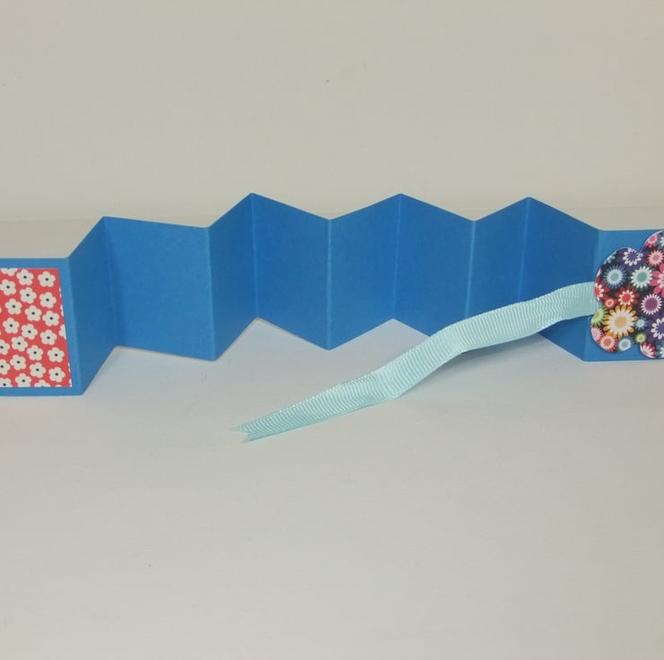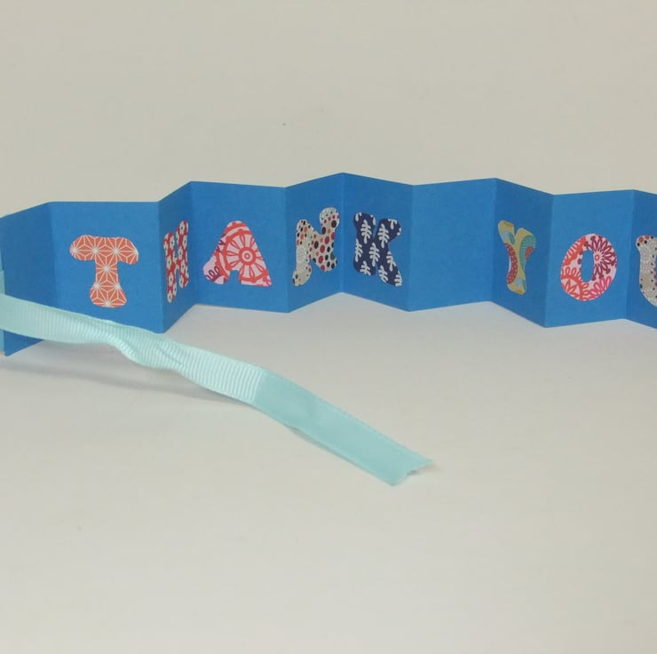 A lovely and unusual way to say ‘Thank You’. This mini zig zag card unfolds to reveal its message, the letters of which are hand-cut from pretty papers. The front of the card is embellished with a card and paper flower and the back is finished off with an oblong of paper. The card is tied together with a length of ribbon which is glued beneath the flower on the front. The card is approximately 4 cm tall and 30 cm long.