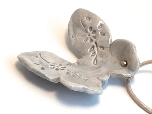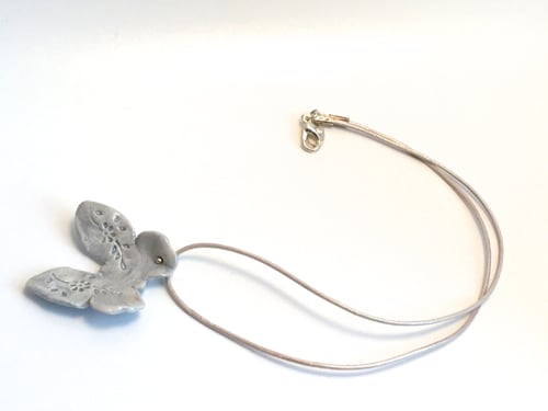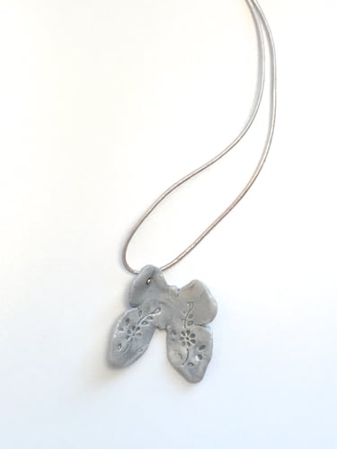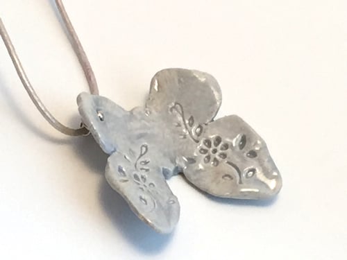 A cute floral textured ceramic butterfly necklace with a pale pastel blue glaze.