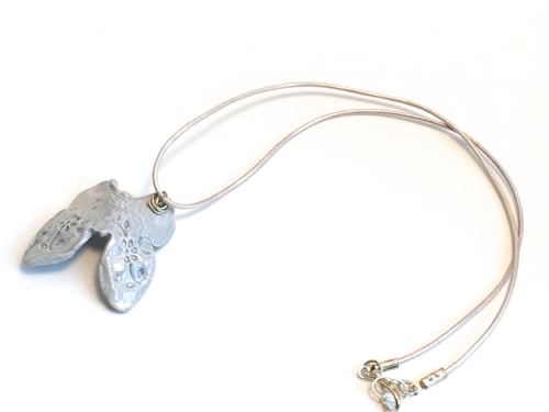 The piece hangs from a 17 inch oyster leather cord with a lobster clasp.