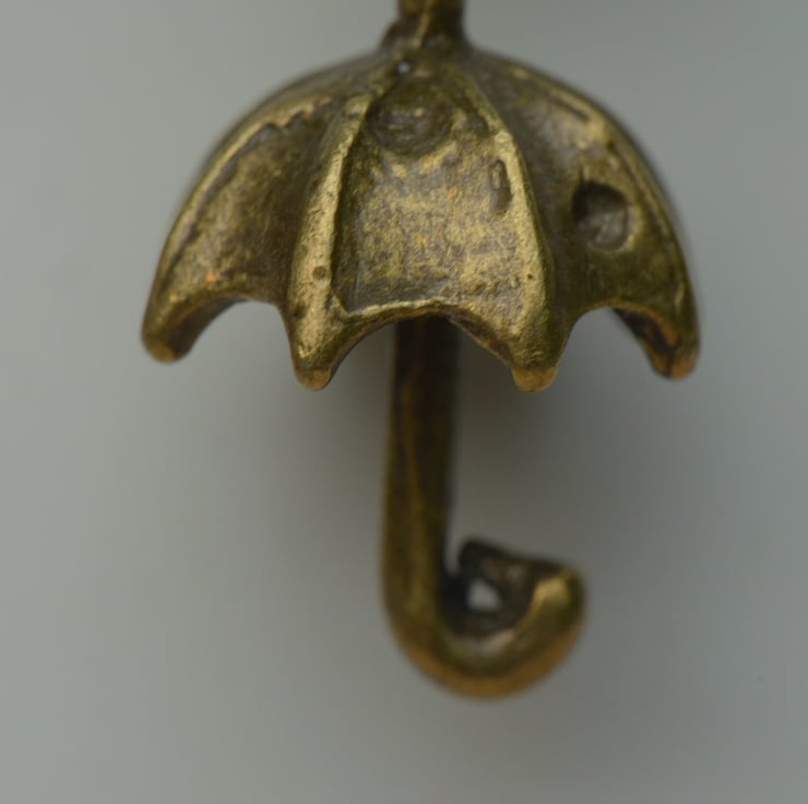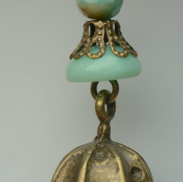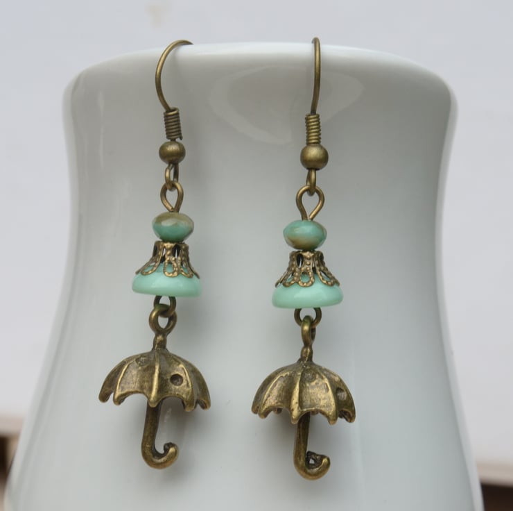 Little antique bronze plated umbrella charms adorn these earrings which I have teamed with Aqua turquoise Czech beads with little beadcaps on antique bronze plated earwires.