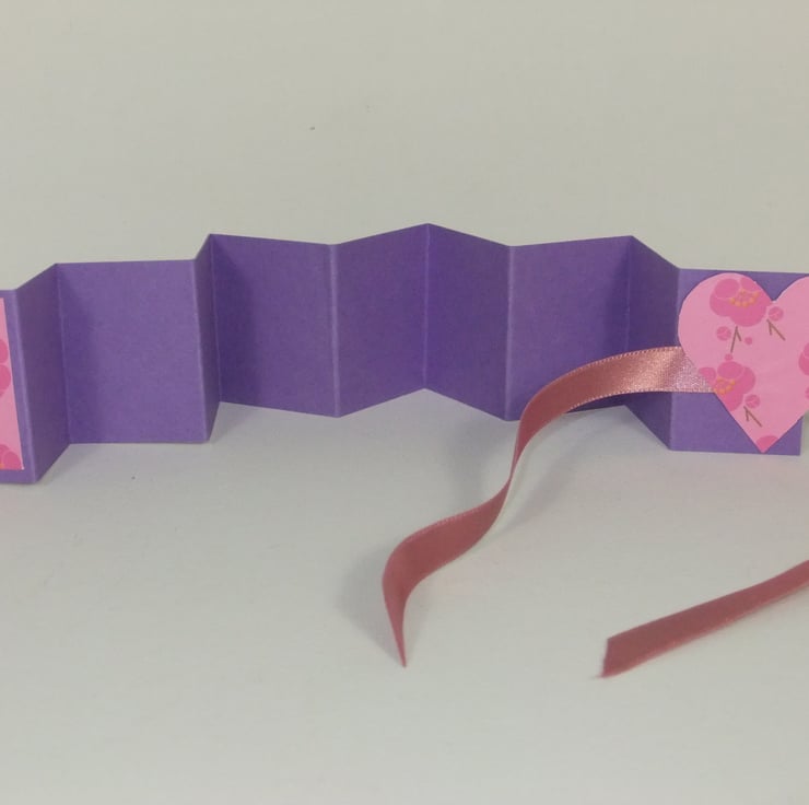 A lovely and unusual way to say ‘I love you’. This mini zig zag card unfolds to reveal its message, the letters of which are hand-cut from pretty papers. The front of the card is embellished with a card and paper heart and the back is finished off with an oblong of decorative paper. The card is tied together with a length of ribbon which is glued beneath the heart on the front. The card is approximately 4 cm tall and 30 cm long.