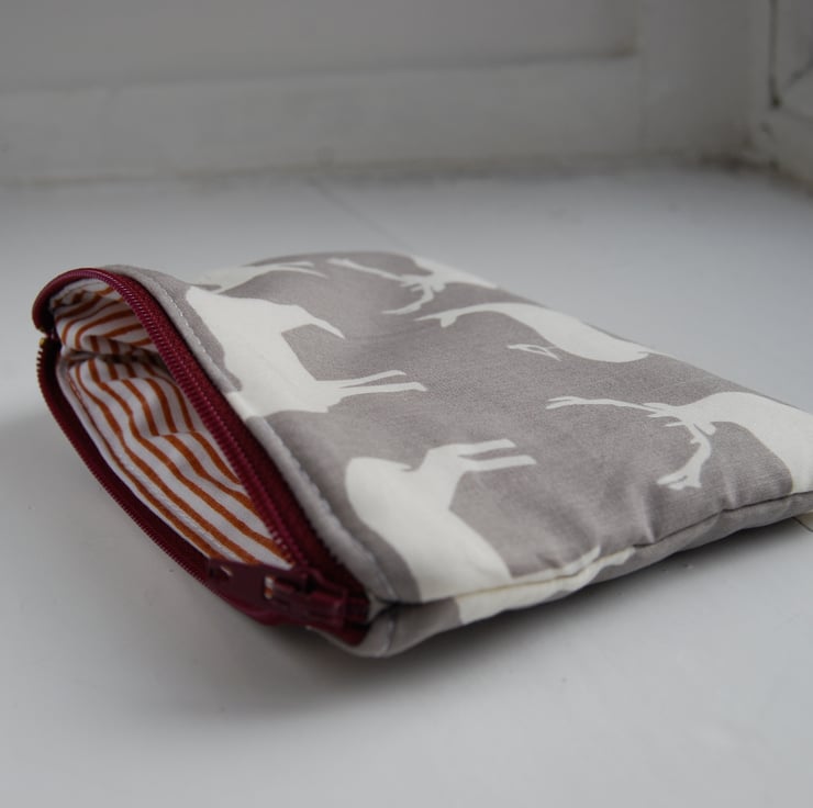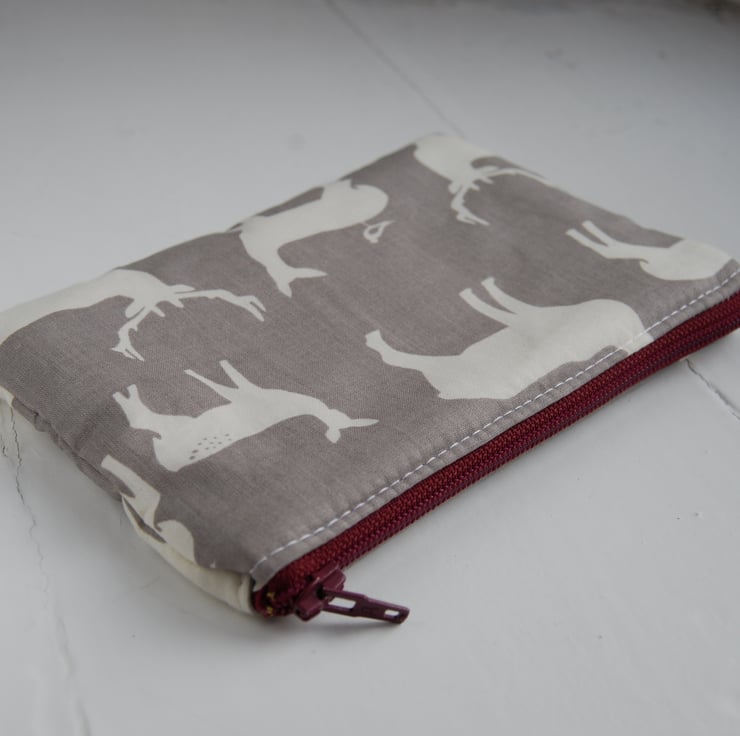 A small zipped purse or pouch. Fully lined. Measures 12cm x 10cm. Ideal for small items like keys or coins, or for keeping crafty items organised. Lined with patterned fabric.