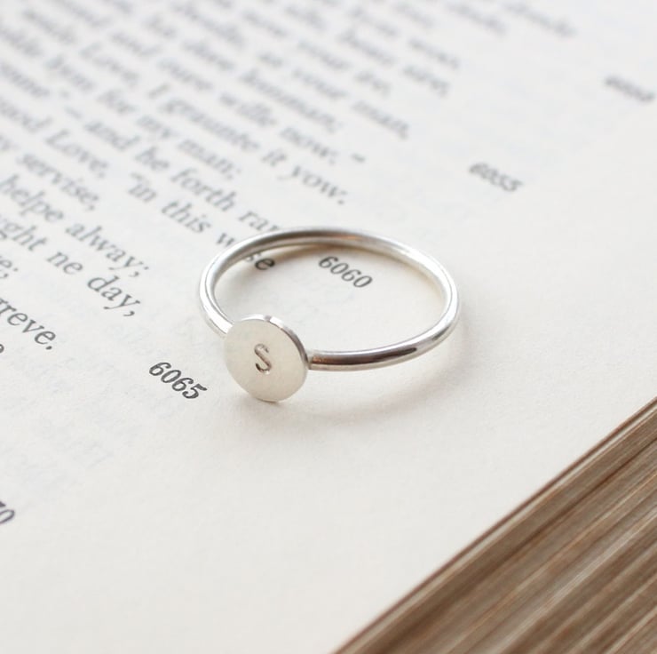 I hand stamp the initial in uppercase letters, and I have soldered the silver disc onto a ring which I have made from 1.5cm diameter silver wire.