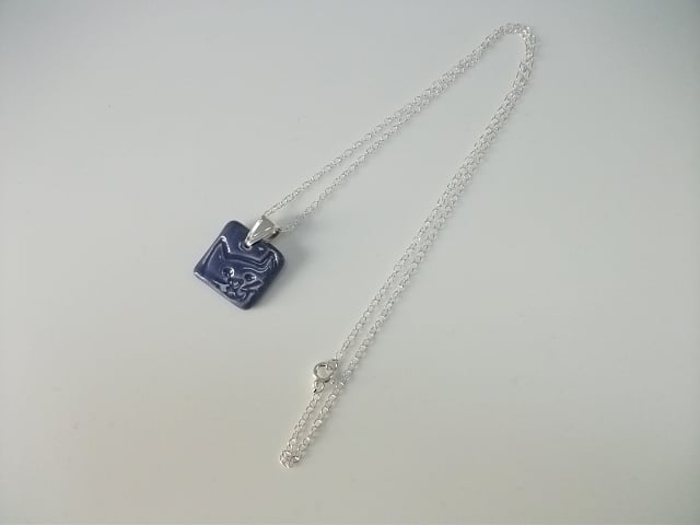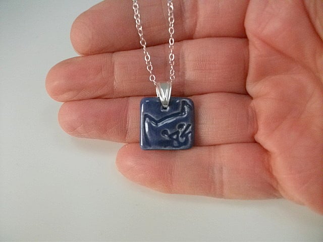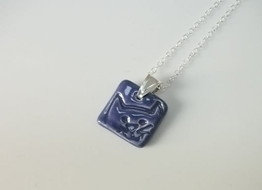 Sale This cute little cat pendant is glazed in a cobalt blue and fired twice. Hanging from a sterling silver pronged bail on an 18 inch delicate trace chain.