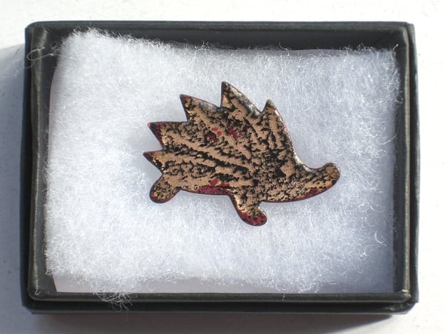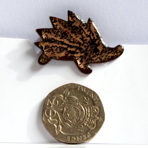 The hedgehog measures 30mm nose to tail, 20mm top to toe. It is mounted on a 20mm brooch bar with a safety catch; the bar is soldered to the brooch.