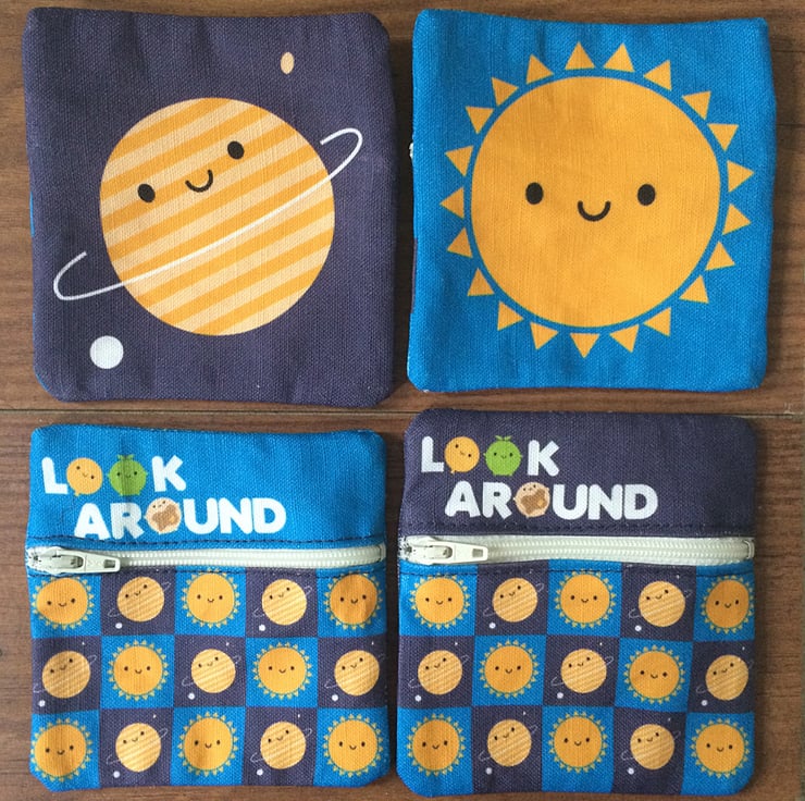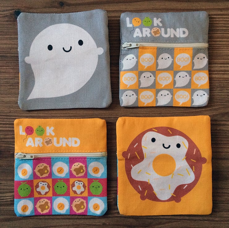 These cute square purses are handmade using custom designed fabric with my Look Around characters. The designs have been created by me, printed on a lovely soft linen cotton blend fabric by Spoonflower and stitched up by my mum!