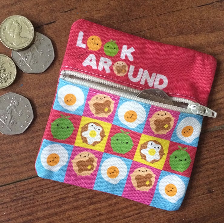 Each purse features a large happy character on the reverse and a smaller squared pattern with Look Around logo on the front. Finished with a sturdy cream zip, these little purses are perfect for your cash, or for those little things that get lost in your handbag. I use mine for a mini portable first aid kit!
