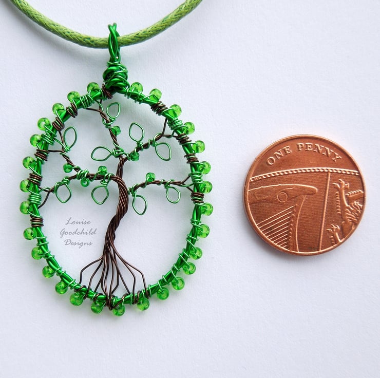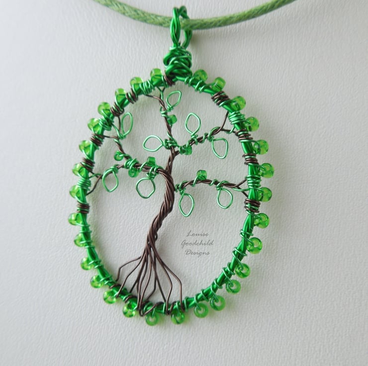 One of my smaller tree pendants, featuring the distinctive wire work style common in my larger pendants. Made entirely from high quality coloured copper wire, with glass seed beads, this one features a tree with emerald green leaves and beads.