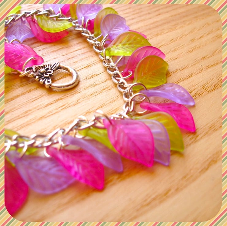 A really cute charm style bracelet which is just waiting to be shown off! This bracelet features a range of pink, purple and green lucite leaves. It's all put together on a silver plated chain. This fun bracelet fastens with a tibetan silver toggle clasp.