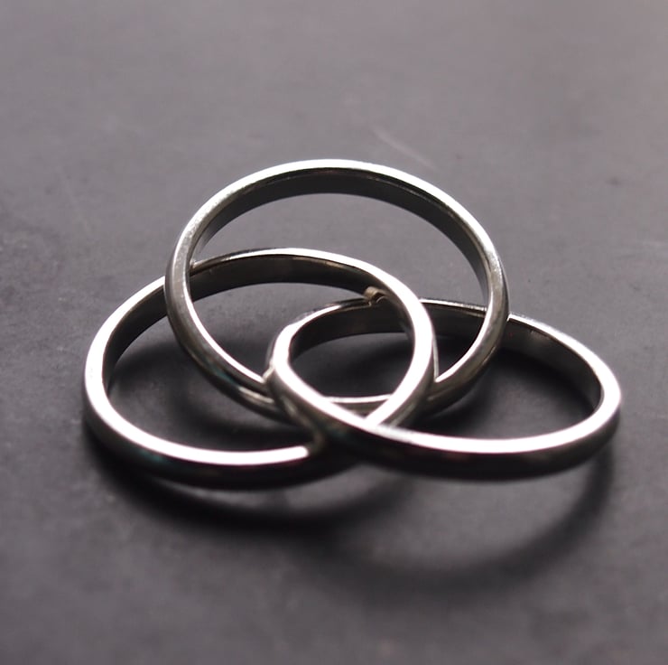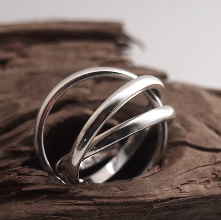 Three half round section rings are interlinked together in a design traditionally known as a Russian wedding ring. These roll over the finger and are great to fiddle with. Each ring is made from 2mm wide and has a nice fat profile. The three rings together are a satisfying weight and have been highly polished.