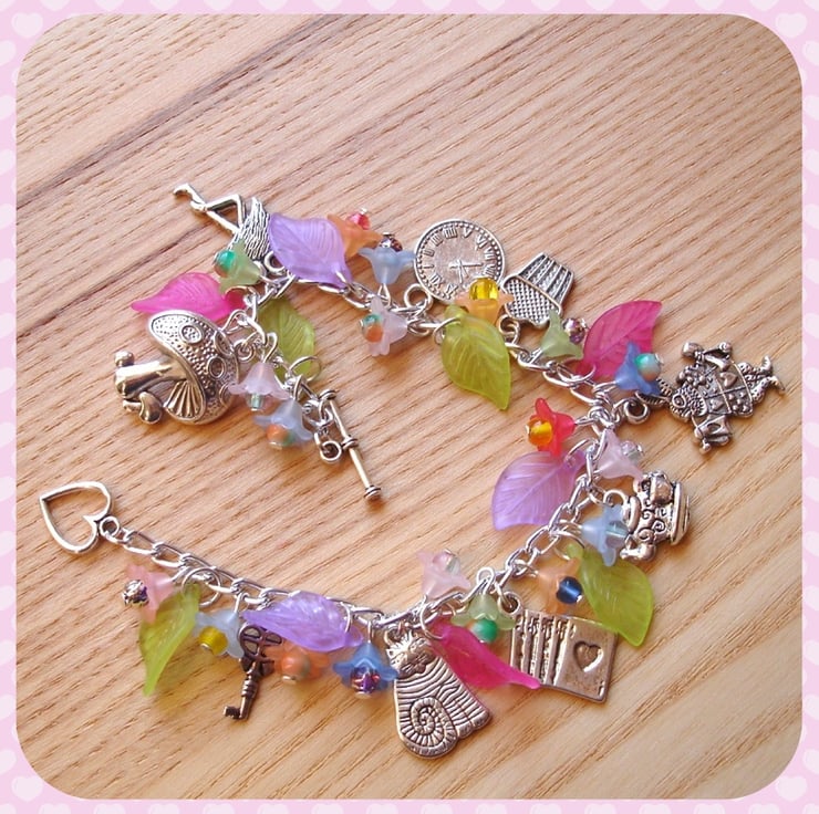 A really cute charm style bracelet which is just waiting to be shown off! This bracelet features a range of tibetan silver Alice In Wonderland charms, Lucite leaves and flowers and glass beads. It's all put together on a silver plated chain. This fun bracelet fastens with a tibetan silver toggle clasp.