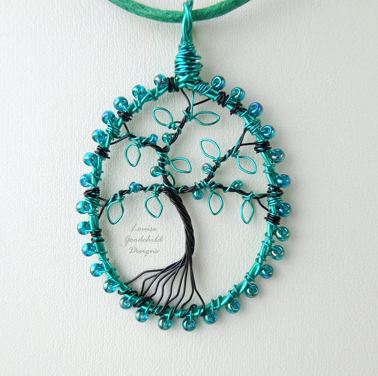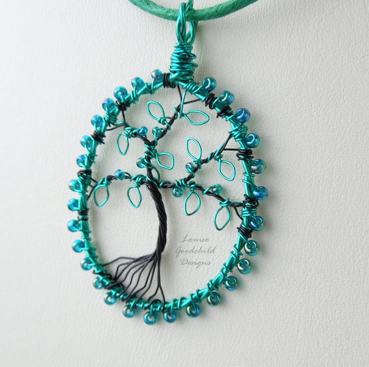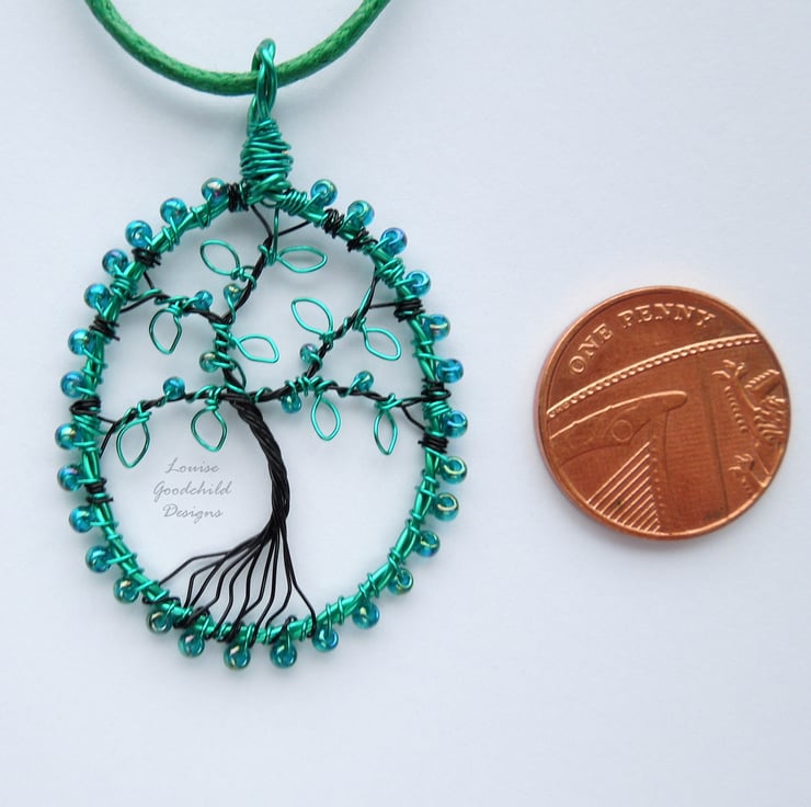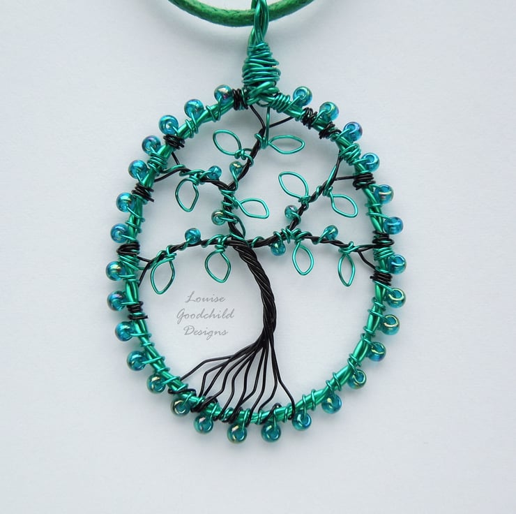 One of my smaller tree pendants, featuring the distinctive wire work style common in my larger pendants. Made entirely from high quality coloured copper wire, with glass seed beads, this one features a tree with iridescent teal green leaves and beads.