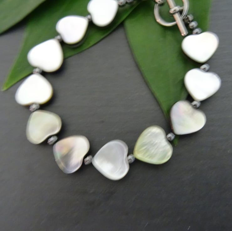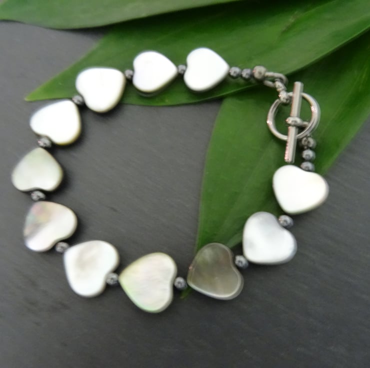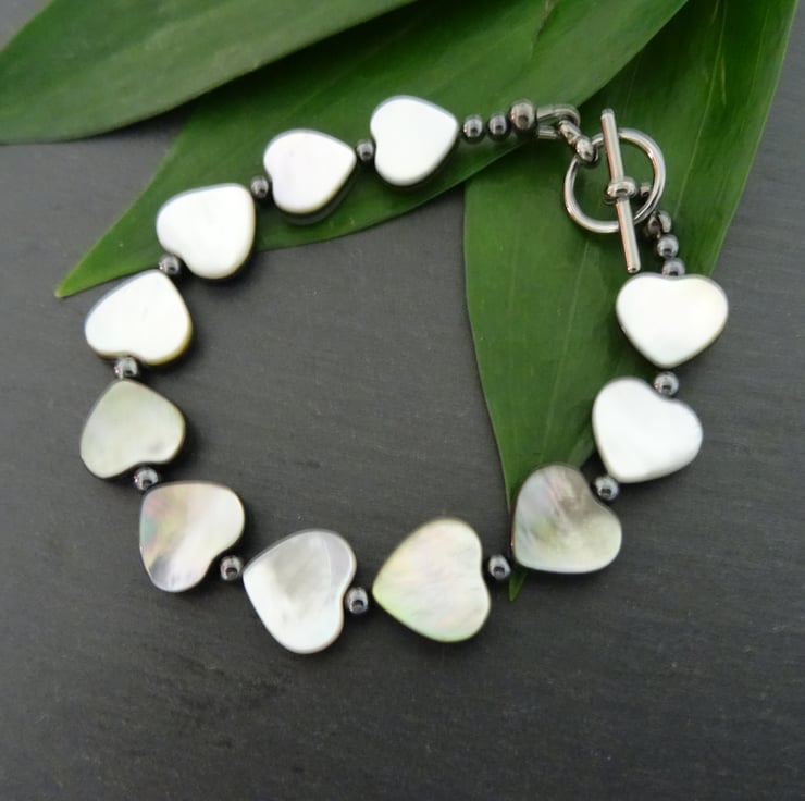 This is a lovely bracelet made with grade A Black Lip Shell Hearts, they have a beautiful lustre. These are interspersed with black plated round 3mm beads. The bracelet measures 19cm (7.1/2") and is finished with a black plated toggle clasp. As all of the items in my shop are individual pieces made by myself, this is the bracelet you will receive. It will arrive gift wrapped in tissue paper and a organza bag.