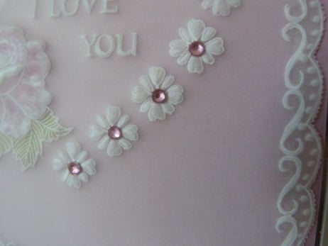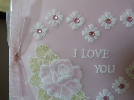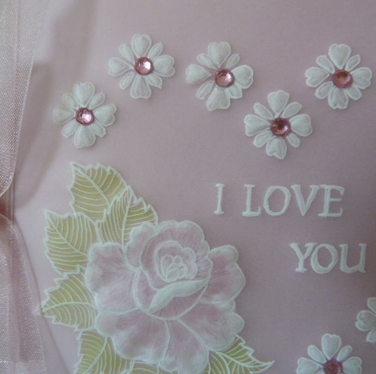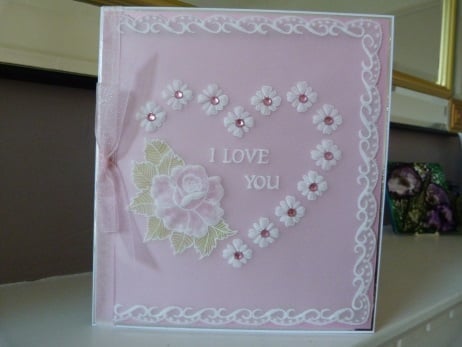 This is completely handmade and consists of a heart of flowers with a beautiful rose completing the heart, embossed onto parchment. A pretty scroll design on three sides. Mounted onto pale pink vellum then onto silver mirri card and then onto quality pristine white card. Finished off with pale pink rhinestones and pale pink ribbon and bow. The rose has been handcoloured in pale pink and pale green. I Love You embossed into the centre of the heart.