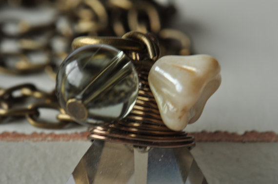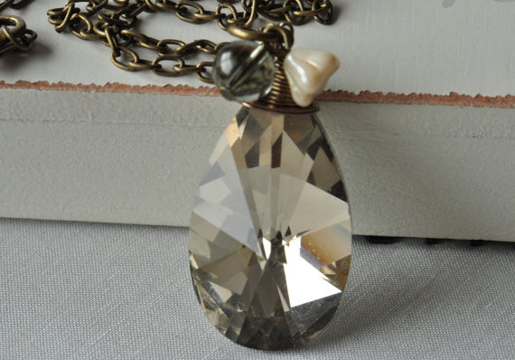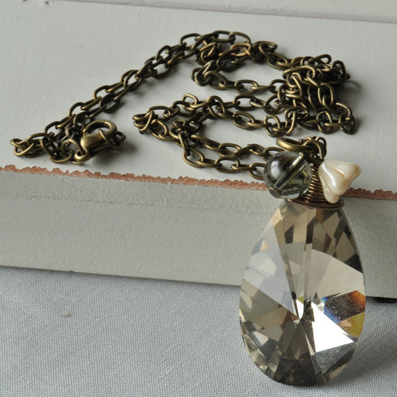 Sparkly acrylic faceted teardrop pendant is hand wire wrapped with antique bronze wire for a vintage feel with a bouquet of a Czech glass beige flower cup and an 8mm Smokey Quartz gemstone nestle on an antique bronze plated chain finished with trigger clasp.