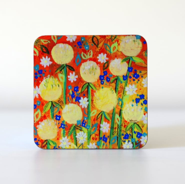 A set of four coasters made of heat resistant wooden surface with gloss finish featuring four of my original paintings titled "Wild Meadow", "Poppy Meadow", "Summer Joy" and "Autumn at Knightshayes". Size: 3.75" x 3.75" (9.5 x 9.5 cm) with rounded corners. The design is protected with a high-quality gloss finish which makes the coasters easy to keep clean. They are perfect as a housewarming gift or you can keep them for yourself for a stylish touch in your home. Please allow at least 7 days for the set to be made.