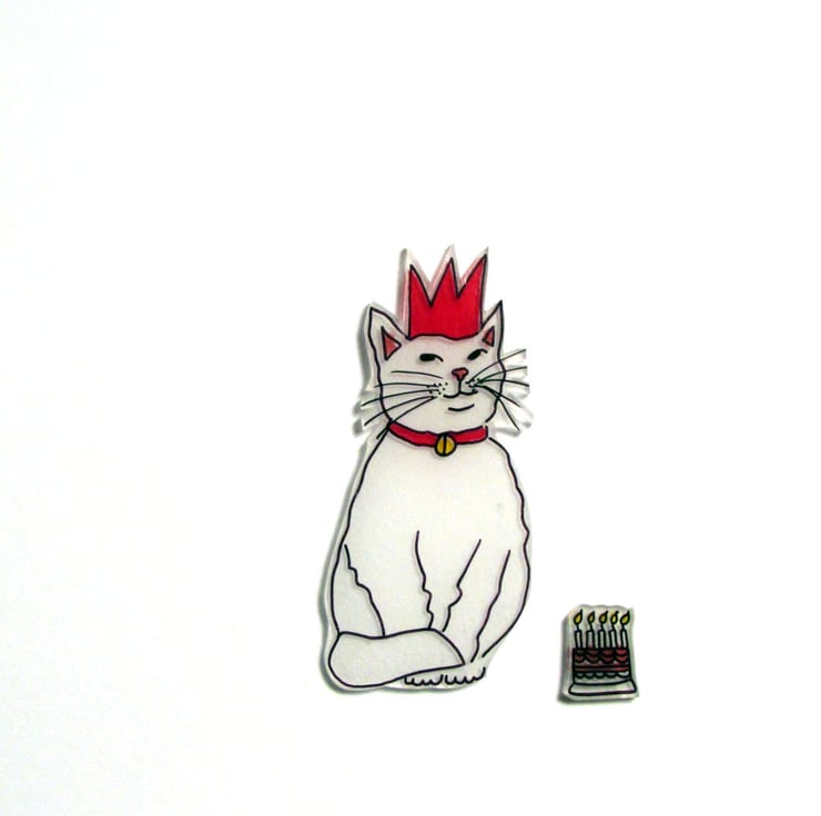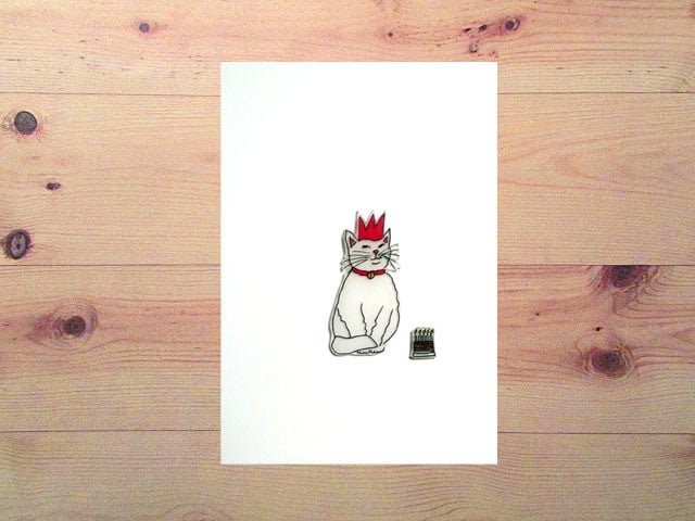 A hand drawn shrink plastic cat and cake on an A6 white card with envelope.