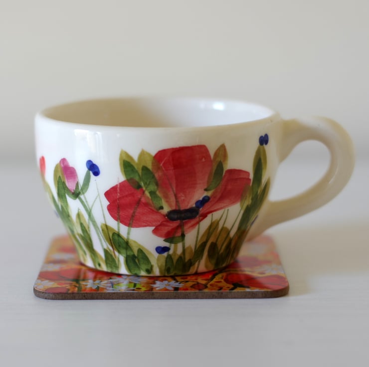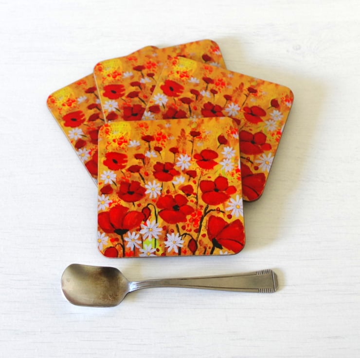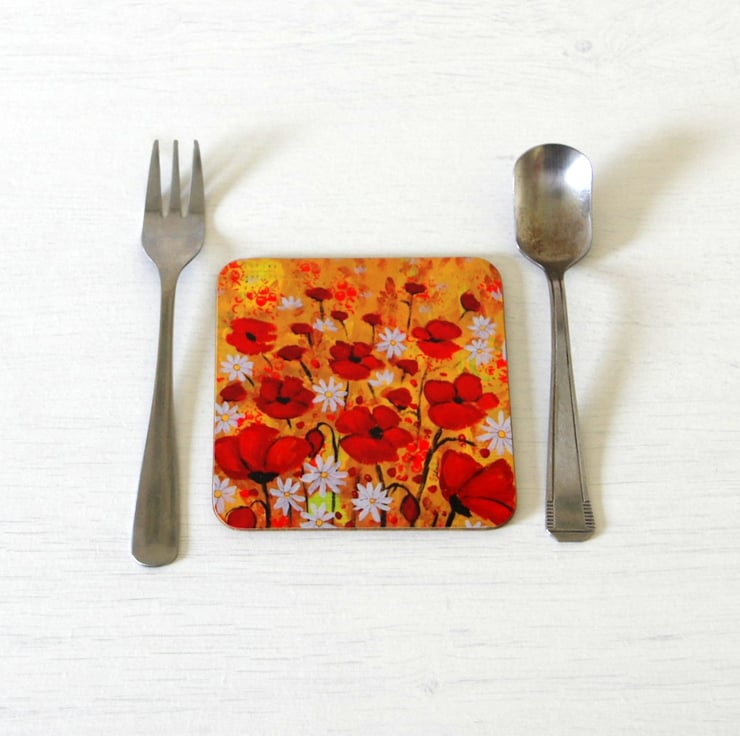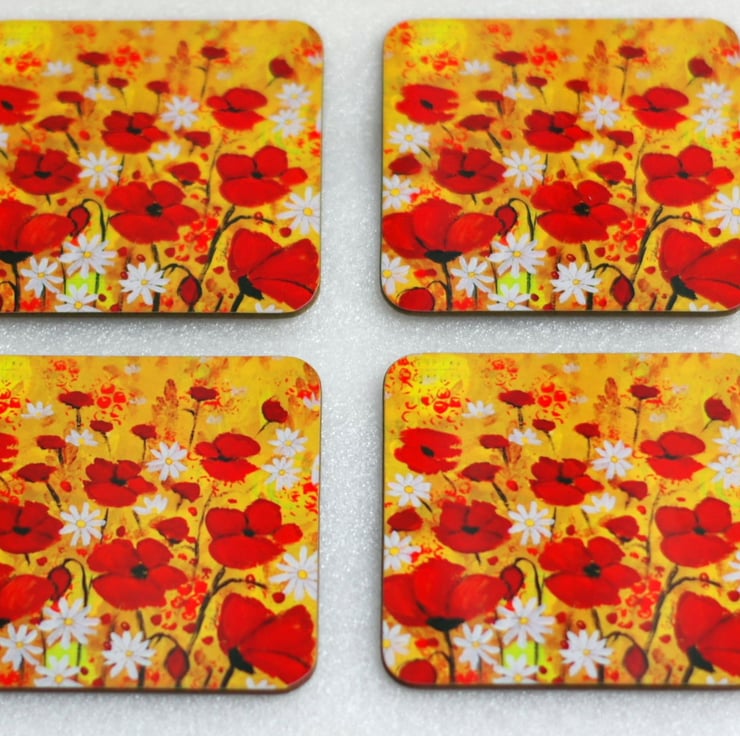 A set of four coasters made of heat resistant wooden surface with gloss finish featuring one of my original painting titled "Poppy Meadow". Size: 3.75" x 3.75" (9.5 x 9.5 cm) with rounded corners. The design is protected with high quality gloss finish which makes the coasters easy to keep clean. They are perfect as house warming gift or you can keep them for yourself for a stylish touch in your home.