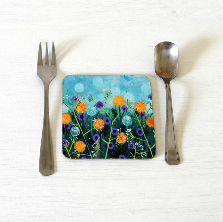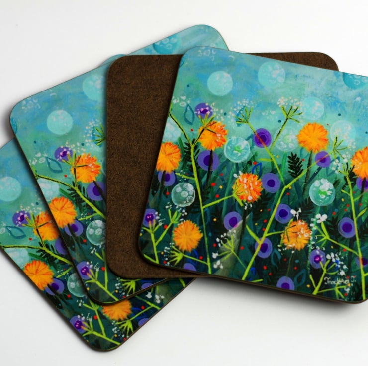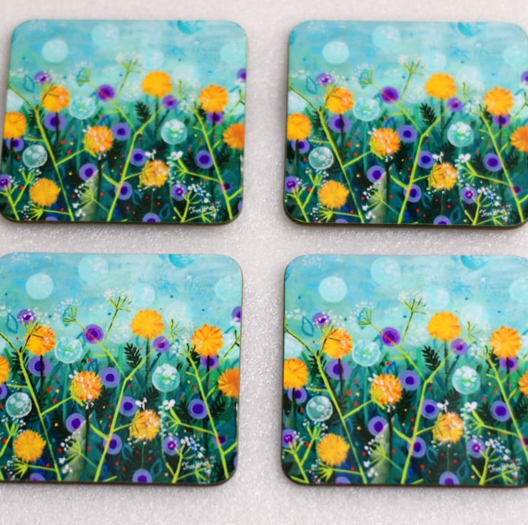 A set of four coasters made of heat resistant wooden surface with gloss finish featuring one of my original paintings titled "Devon Meadow II". Size: 3.75" x 3.75" (9.5 x 9.5 cm) with rounded corners. The design is protected with high quality gloss finish which makes the coasters easy to keep clean. They are perfect as house warming gift or you can keep them for yourself for a stylish touch in your home.
