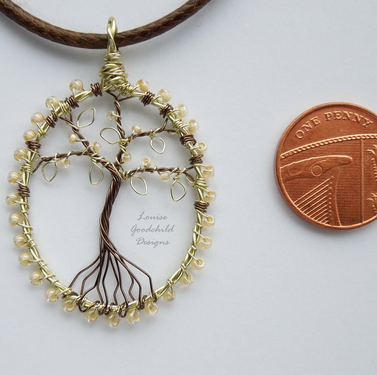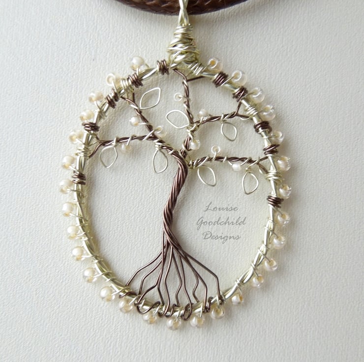 One of my smaller tree pendants, featuring the distinctive wire work style common in my larger pendants. Made entirely from high quality coloured copper wire, with glass seed beads, this one features a tree in shimmering brown and champagne wire, with ivory beads.