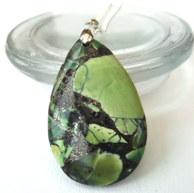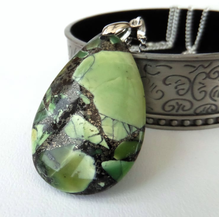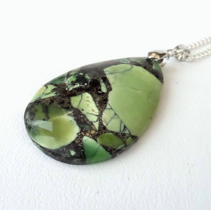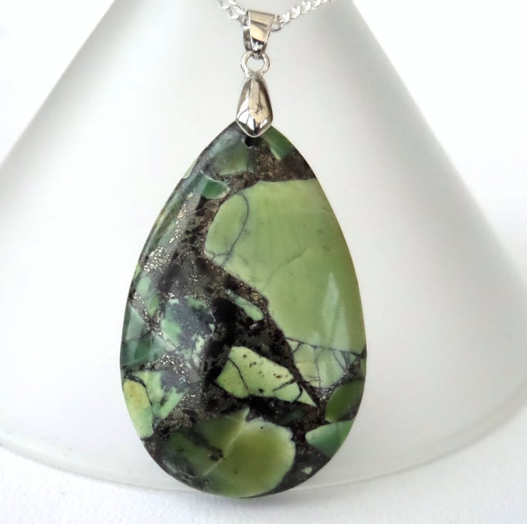 A really unusual and totally striking teardrop shaped jasper pendant hangs from a silver plated chain to make this unique necklace.