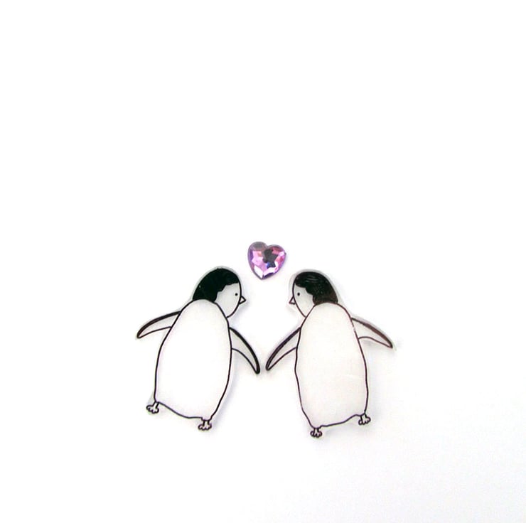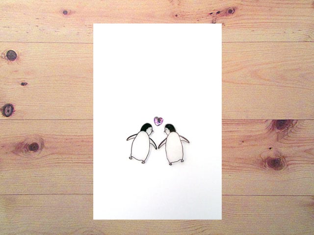 Hand drawn shrink plastic penguins with pink heart on an A6 white card with envelope.