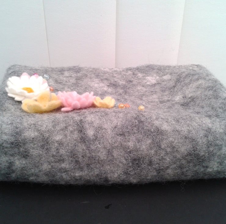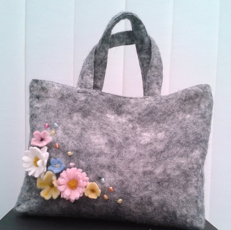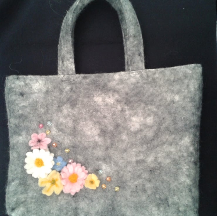 This bag has been made using a nuno felting technique to bind natural grey Norwegian wool to a cotton muslin base which provides a strong and stable material. Spring flowers made using hand made felt and needle felting techniques have been added to one side of the bag, along with a few multicoloured faceted acrylic beads. The reverse side is plain. It has integral handles, a flat base and is lined with cotton cream calico fabric. A magnetic clasp provides closure at the top of the bag. Measuring approximately 12" across the top, 8" high and a base width of 2" this bag is ideal for many uses, a handbag, small shopping bag or craft bag.