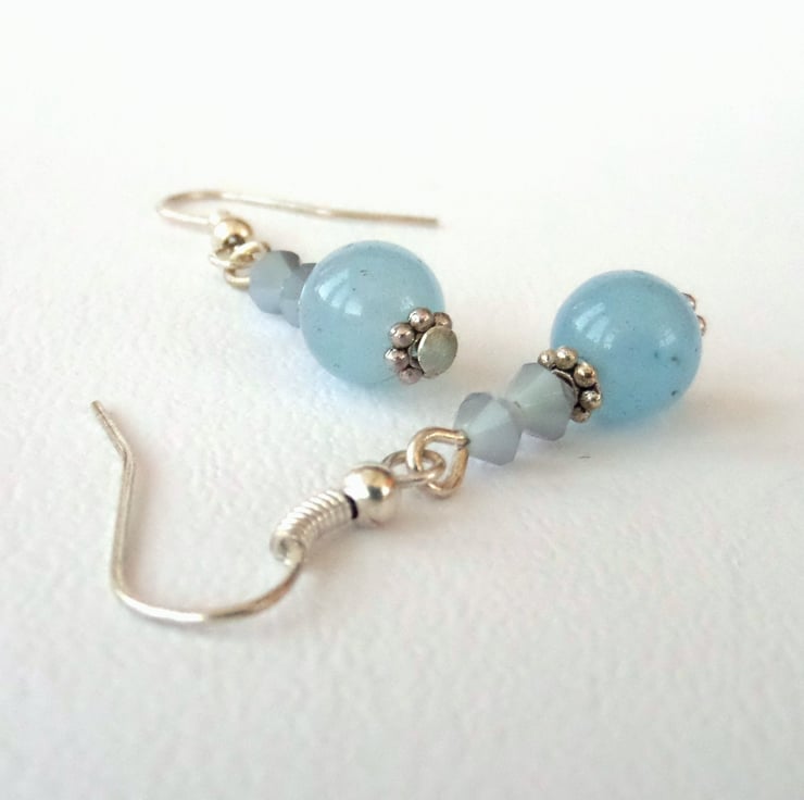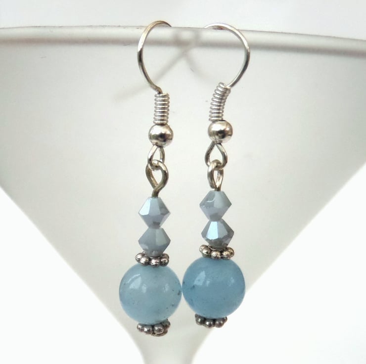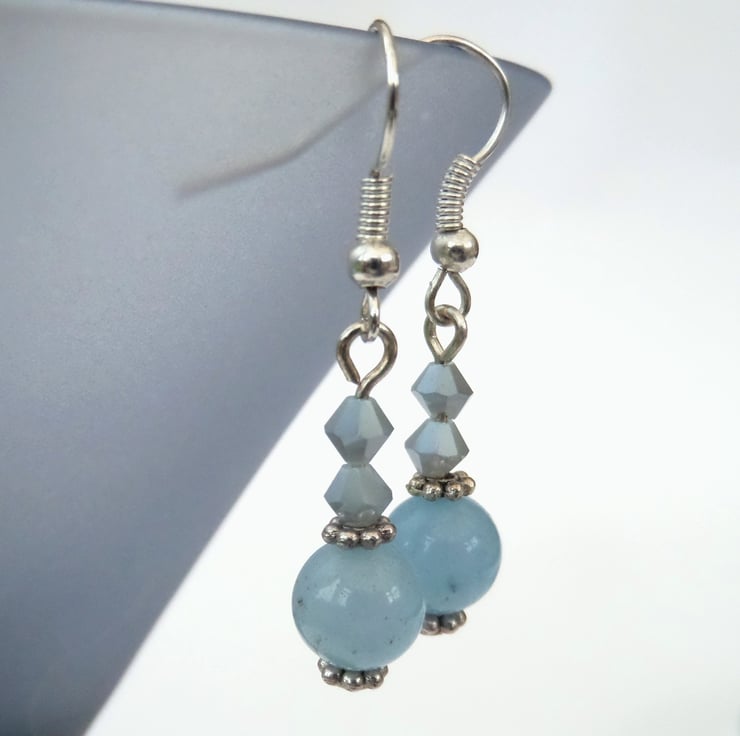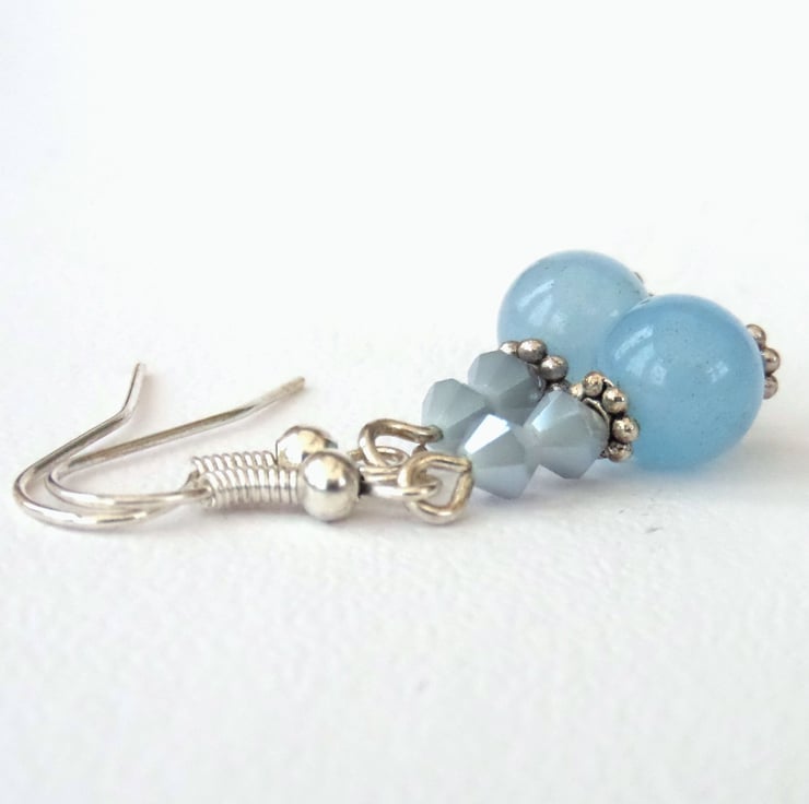 A lovely delicate shade of blue jade and pastel blue crystals combine in these pretty handmade earrings.