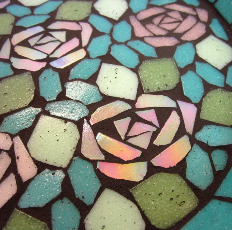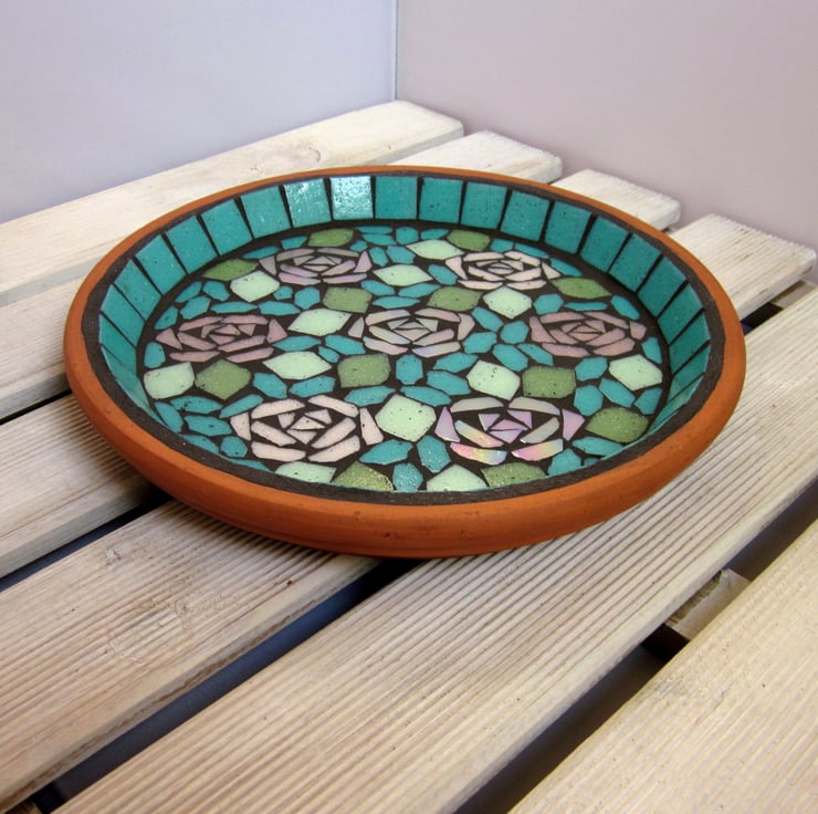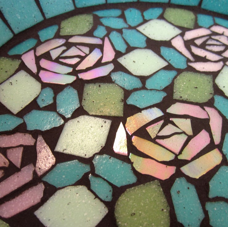 The colours of this bird bath give it a lovely vintage feel with the roses in pale and blush pinks, the pastel green leaves and the jade green background and border. Some of the roses are made with iridescent tiles that shine with metallic colours, adding more interest to the design.