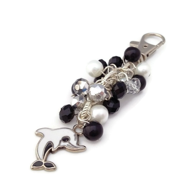 All of the beads are attached to a length of silver plated chain using headpins. At the bottom of the charm hangs an enamelled dolphin in black and white.