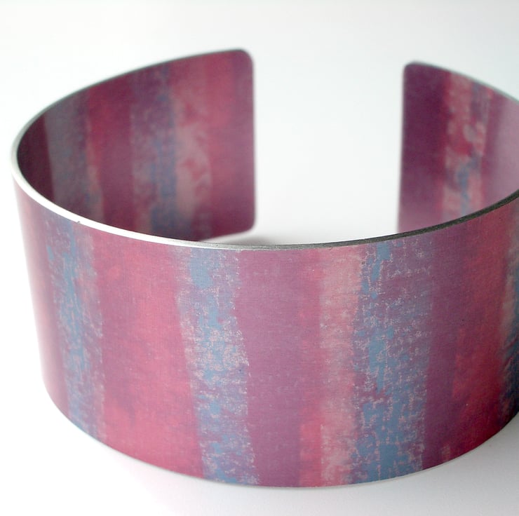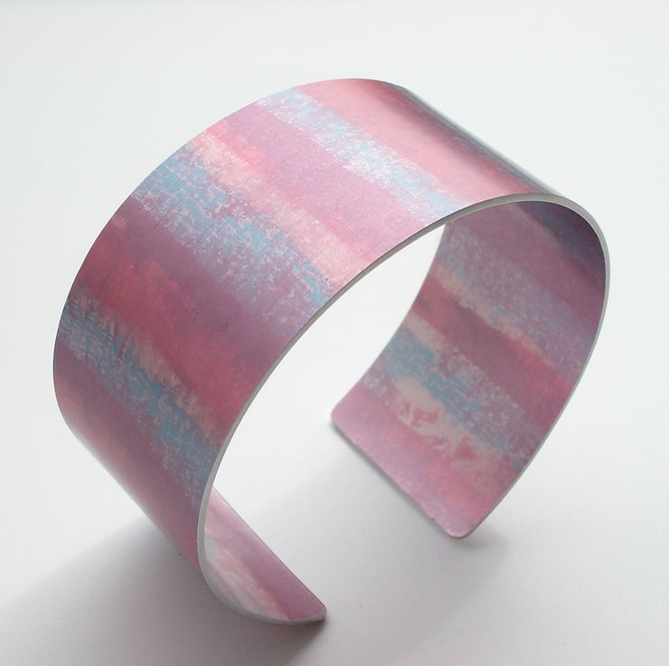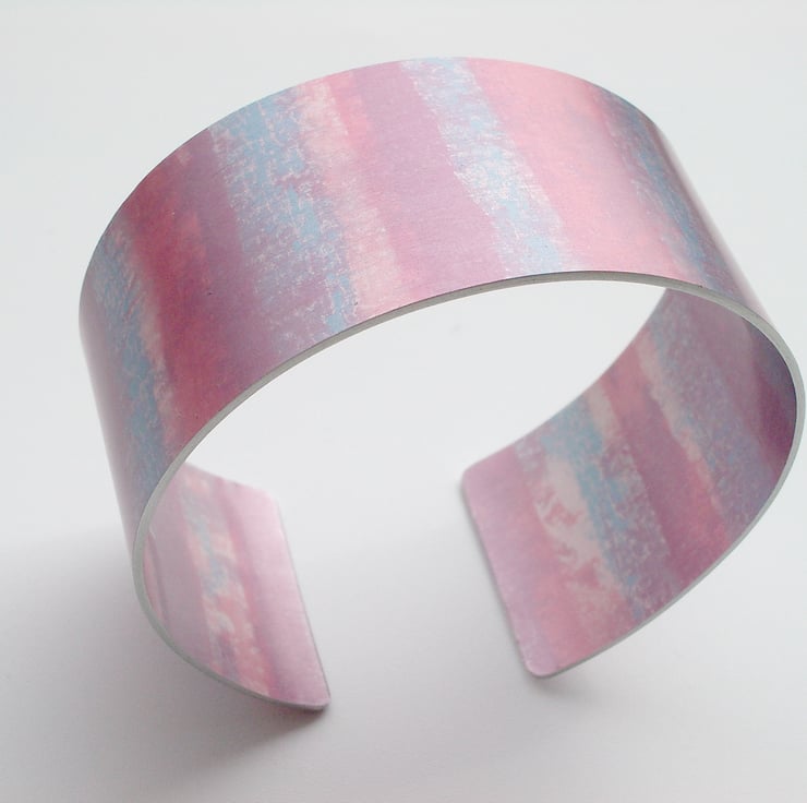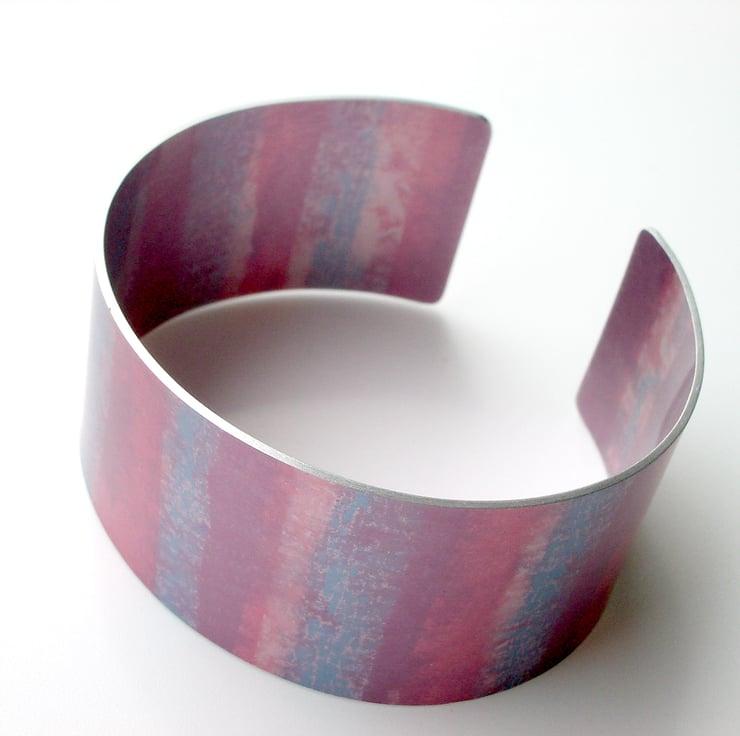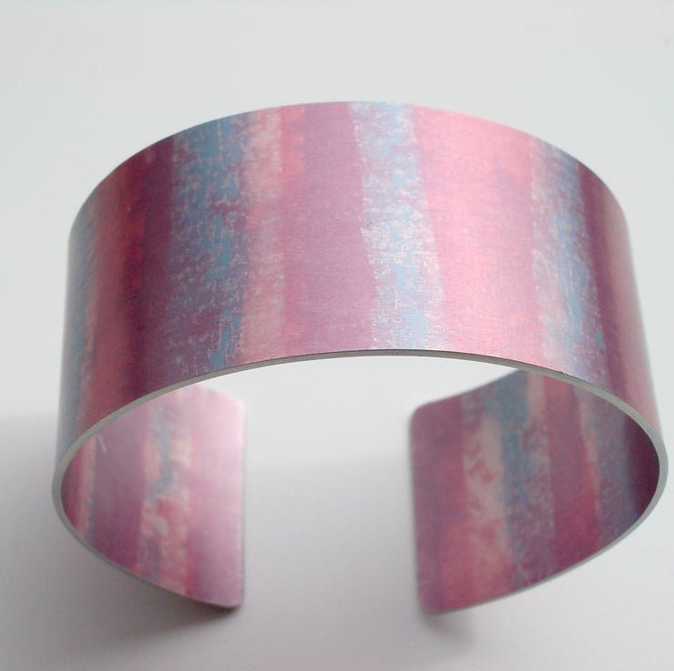 This pretty pink and blue cuff is hand crafted from aluminium which I have dyed in layers to achieve this striped pattern. I then seal the dye so that it becomes a permanent part of the metal. The cuff shape is saw pierced by hand and then shaped around a mandrel. I then file and wire wool the edges so that they feel smooth and comfortable to wear.