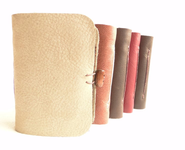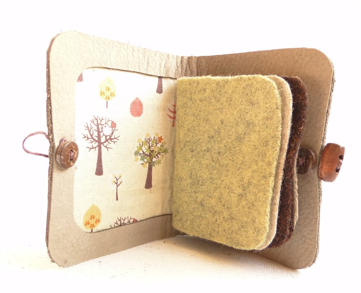 Keep them together in this brown leather case, measuring 9cm x 7xm with a cute tree fabric interior and six separate 'pages' for needle storage in light green, brown and cream felt. Fastened with a toggle button.