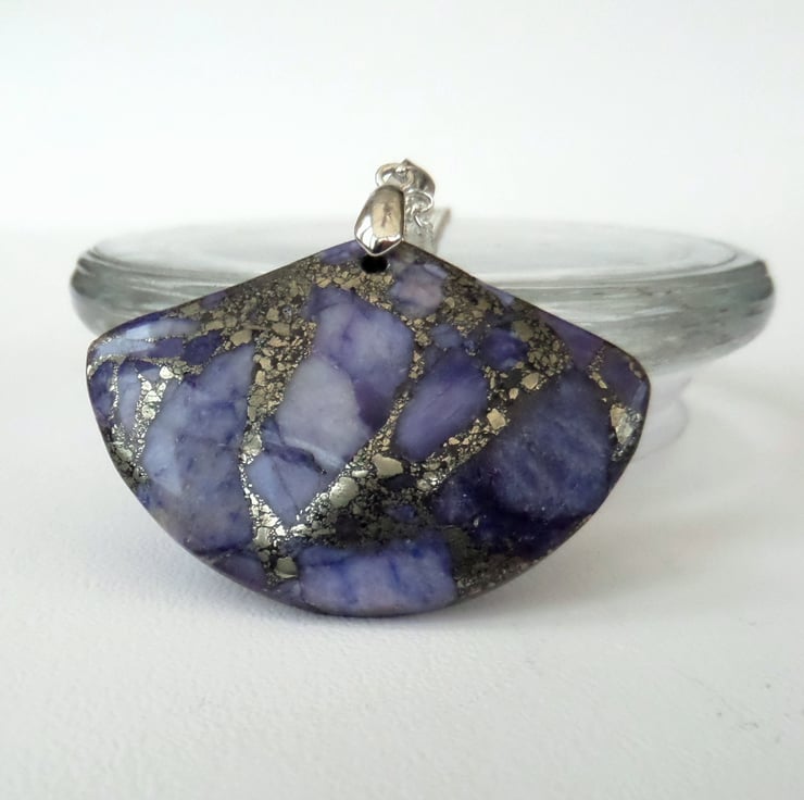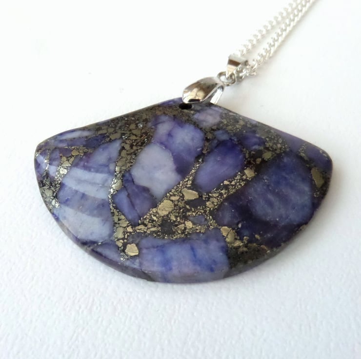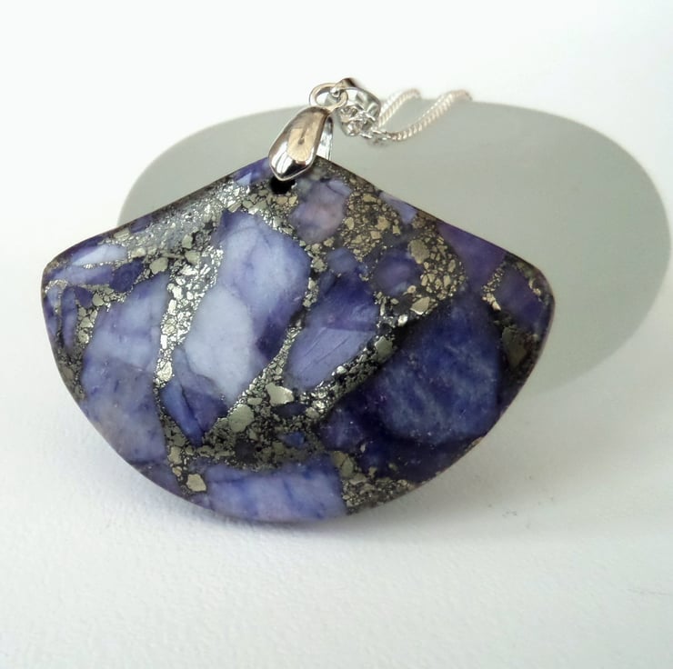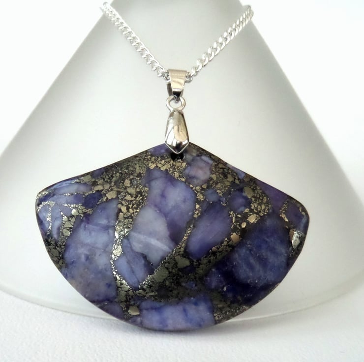 An unusual and totally striking fan shaped jasper pendant hangs from a silver plated chain to make this unique necklace.