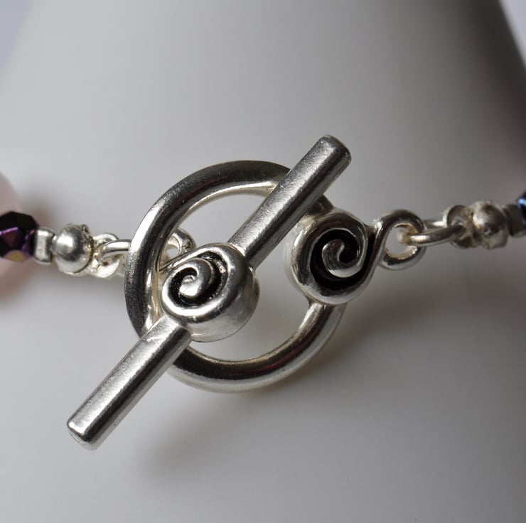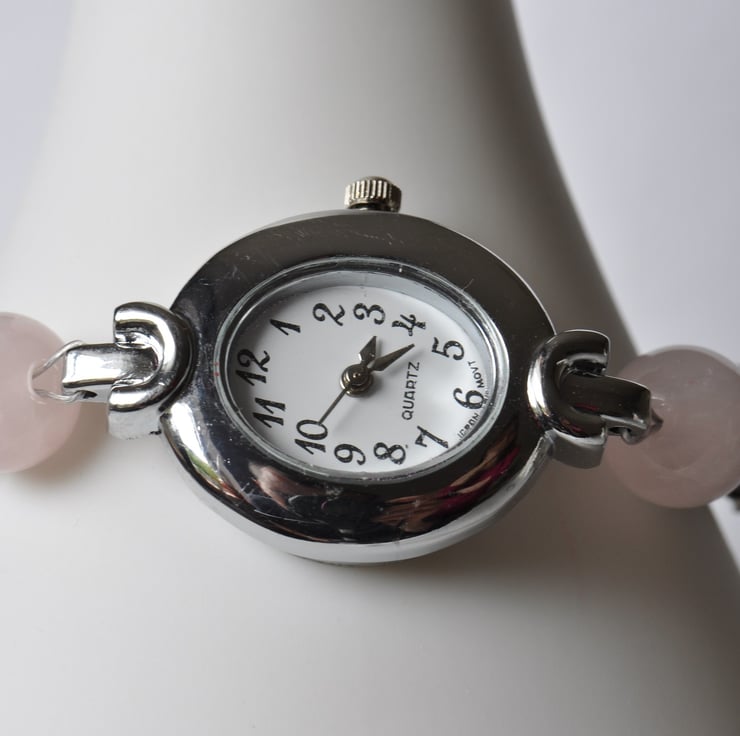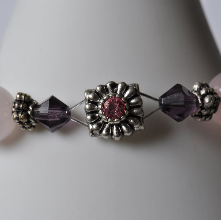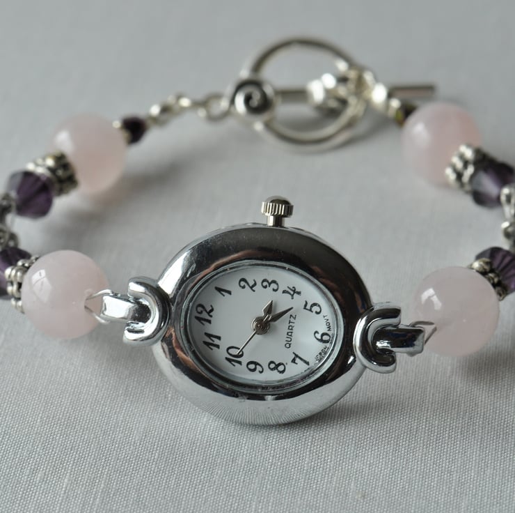 A lovely beaded watch comprising of a beaded strap of Rose Quartz rounds, purple glass and faceted beads, Tibetan silver style spacer beads and Swarovski crystal slider beads with rose pink diamante centre.