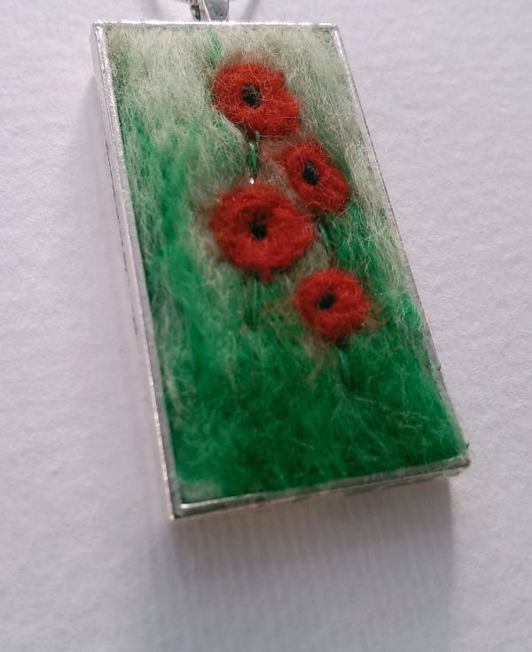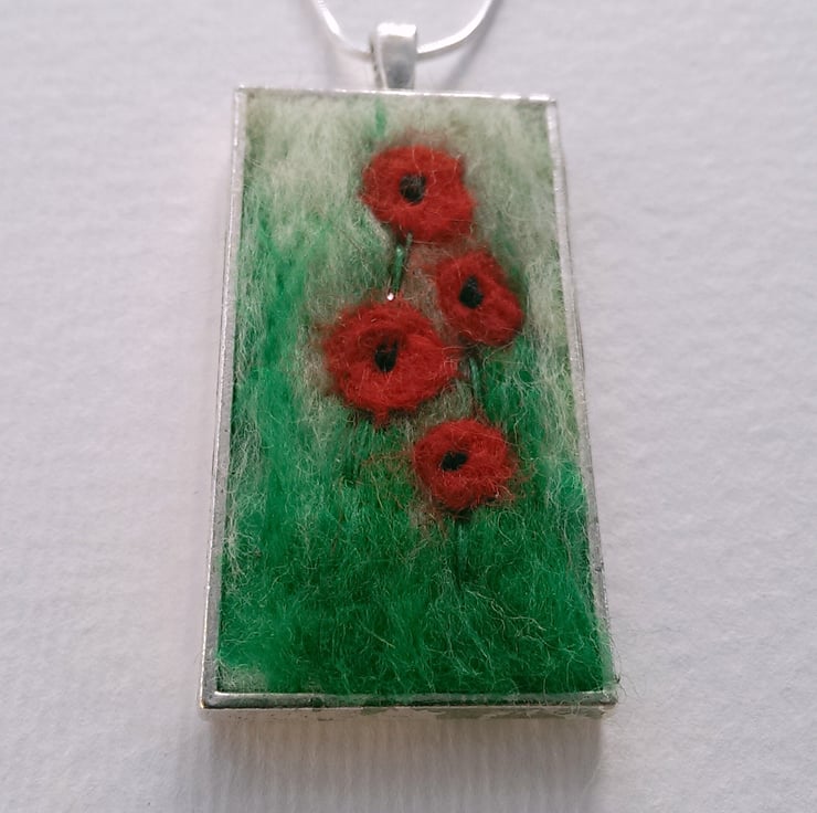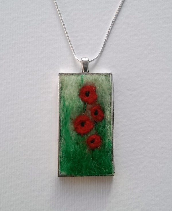 Unique wearable art jewellery. This is a needle felted pendant with poppy field image and hand stitching set in a aged silver tone setting. The pendant is suspended from a sterling silver chain, 18 inches in length and the pendant is approximately 1 x 2 inches. Each pendant is your very own piece of artwork, with no two being the same due to the nature of the technique.