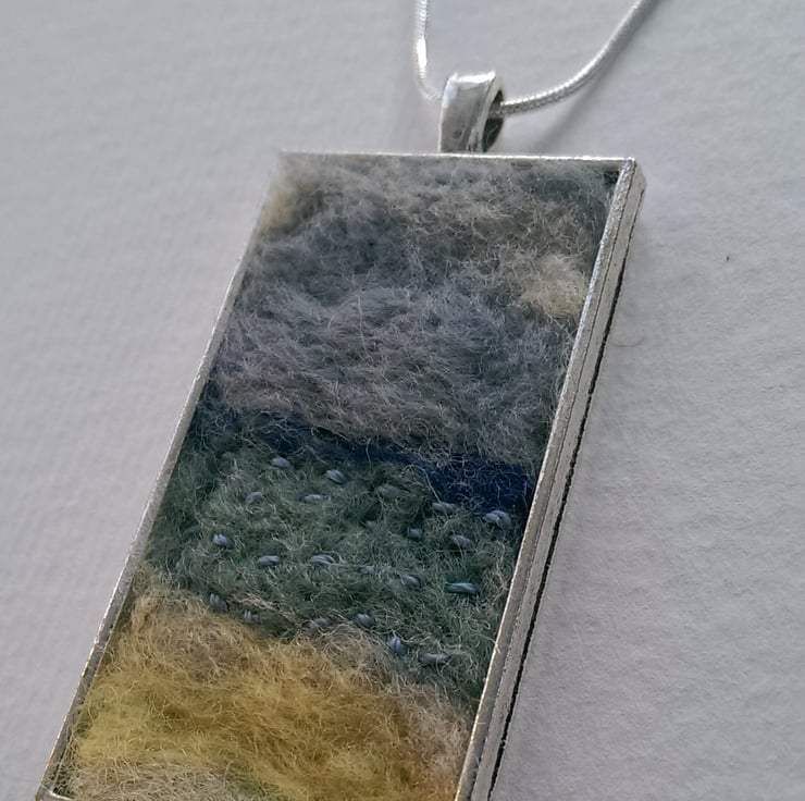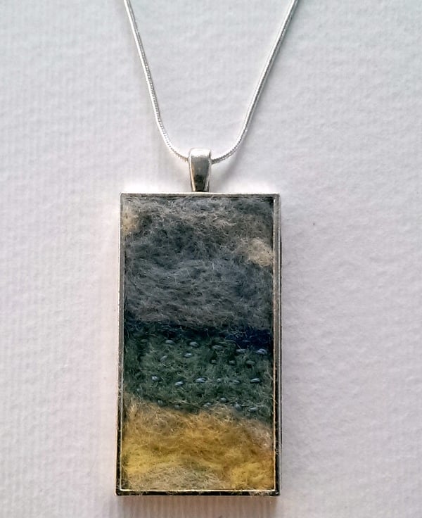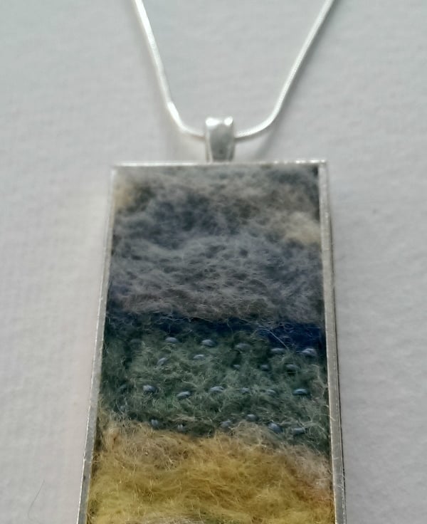 Unique wearable art. This is a needle felted pendant with a hand stitched seascape image set in a aged silver tone setting. The pendant is suspended from a sterling silver chain, 18 inches in length and the pendant is approximately 1 x 2 inches. Each pendant is your very own piece of artwork, with no two being the same due to the nature of the technique.
