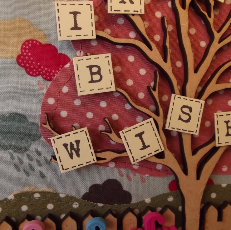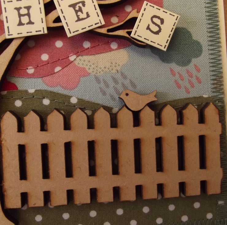 I have made the background of the card from fabric. The tree is wooden as is the fence, even the umbrella's are made from wood!
