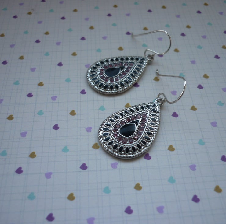 BLACK, PINK AND SILVER PAISLEY, TEARDROP BOHO STYLE EARRINGS. 1072