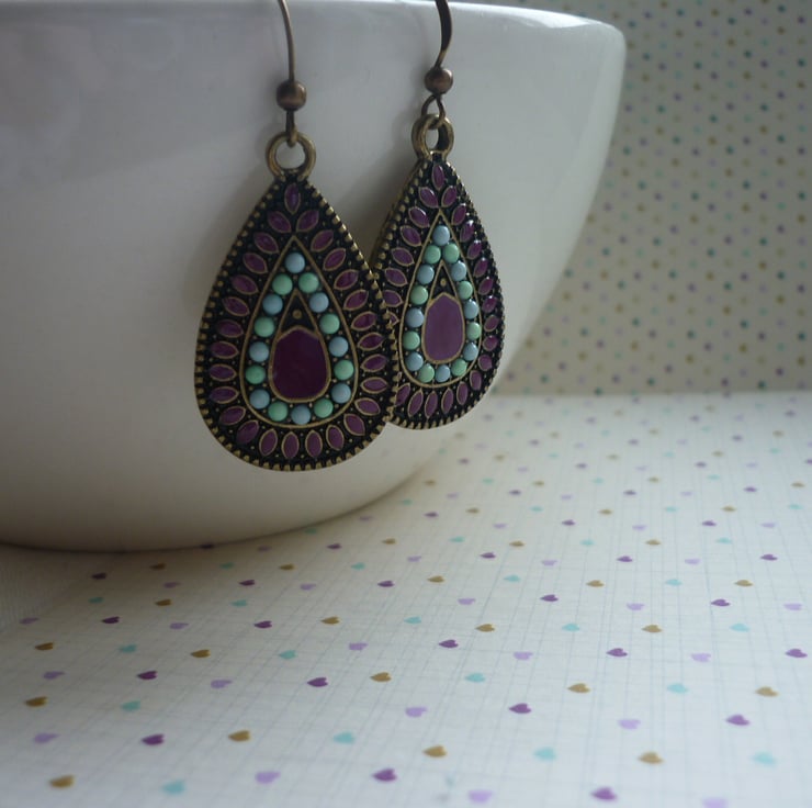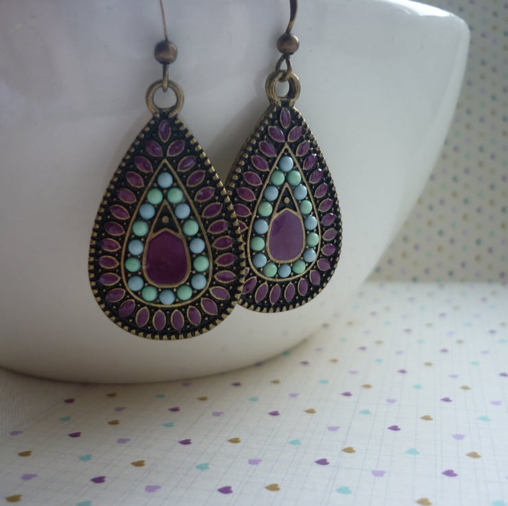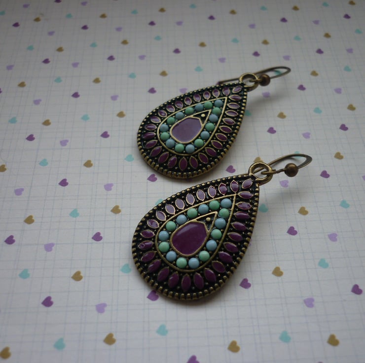 PURPLE, AQUA AND BRONZE PAISLEY TEARDROP BOHO STYLE EARRINGS.